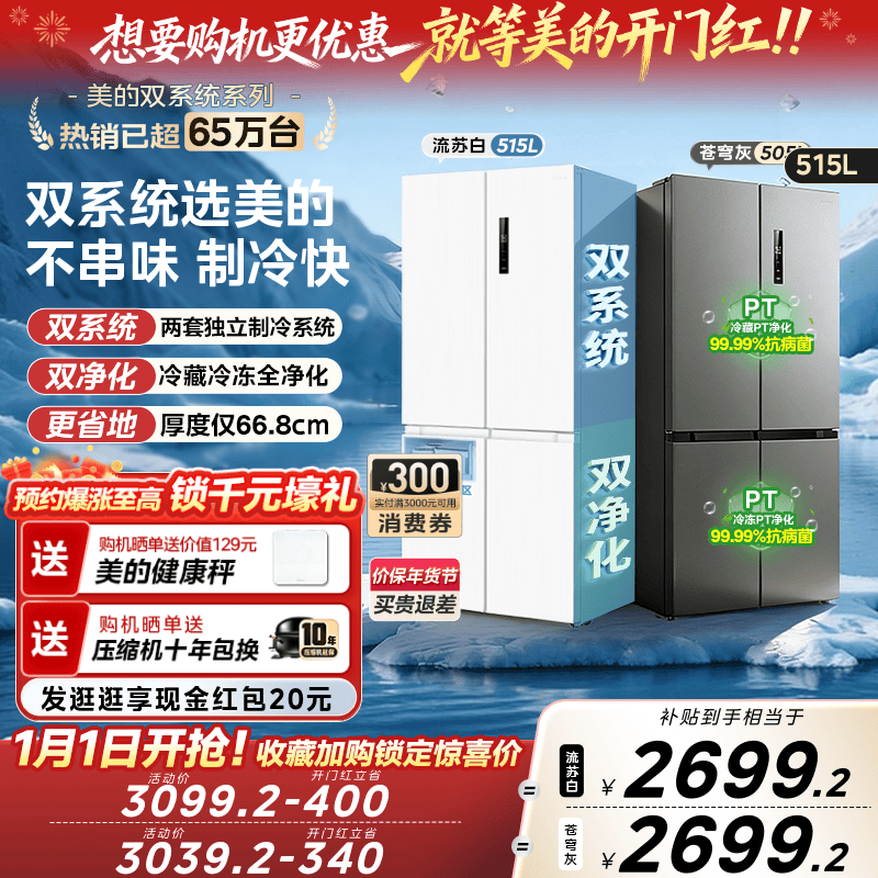 【双系统】美的540大容量十字双开四门风冷无霜冰箱家用带制冰盒