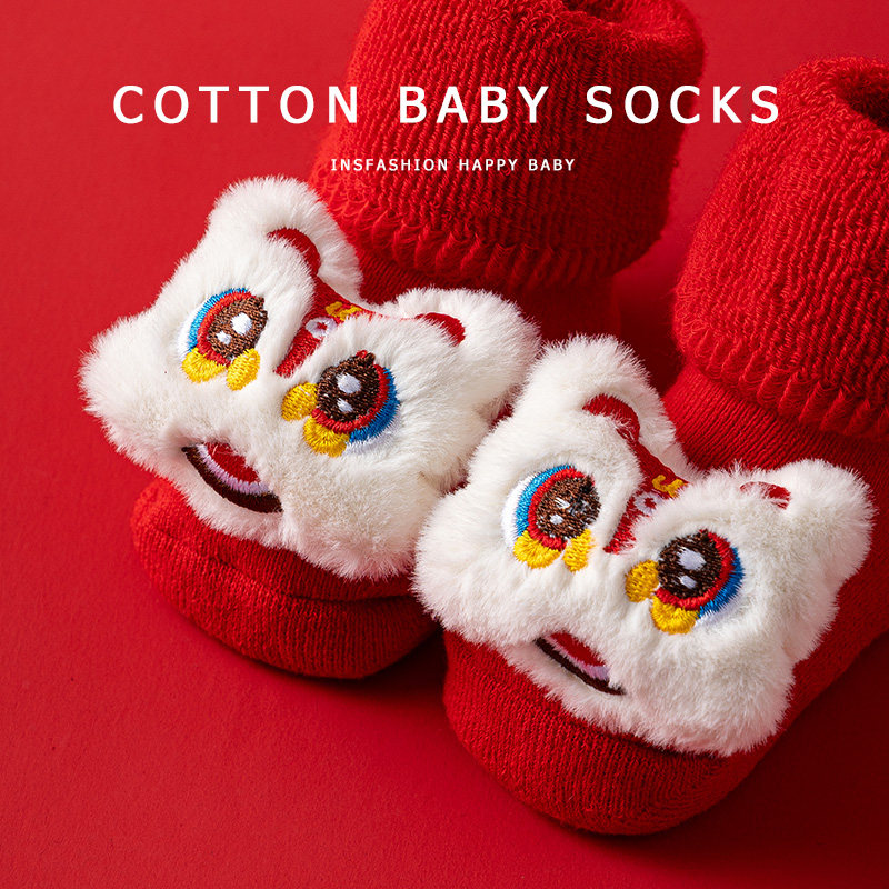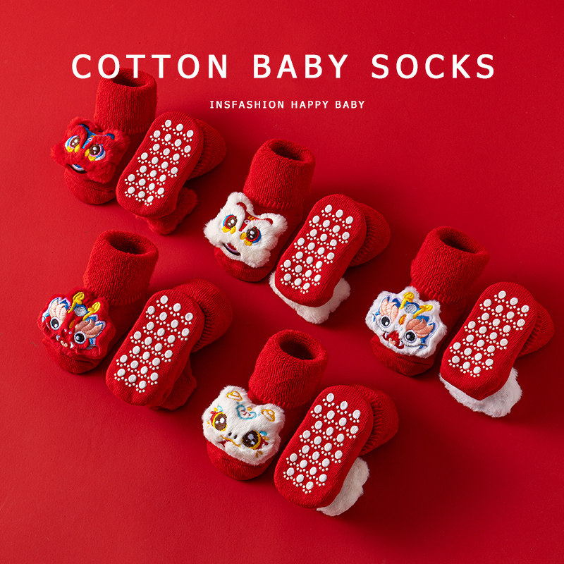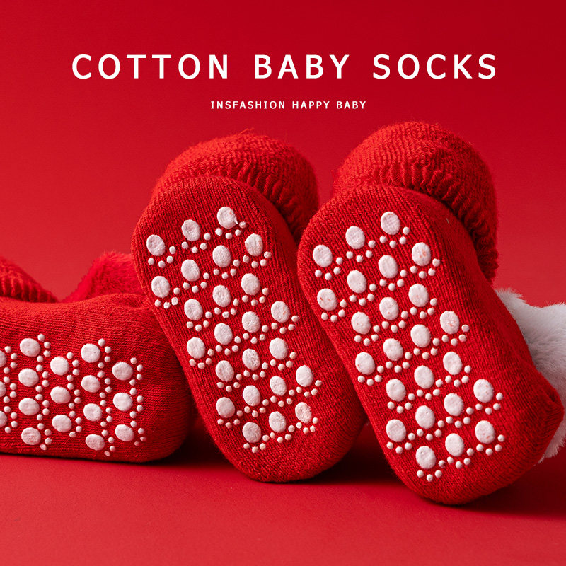 新生儿婴儿袜子秋冬季纯棉加厚大红色宝宝过新年蛇年学步地板袜子