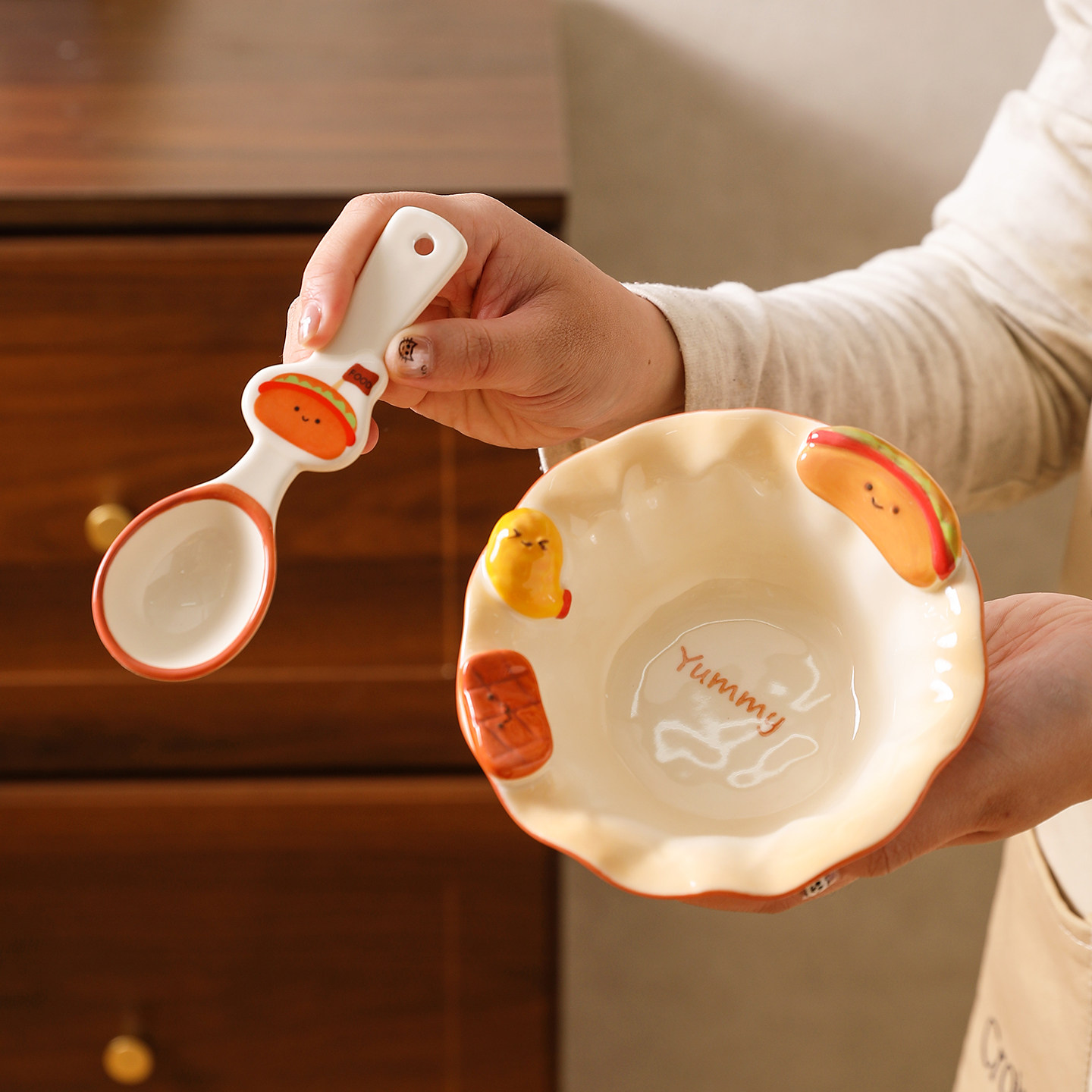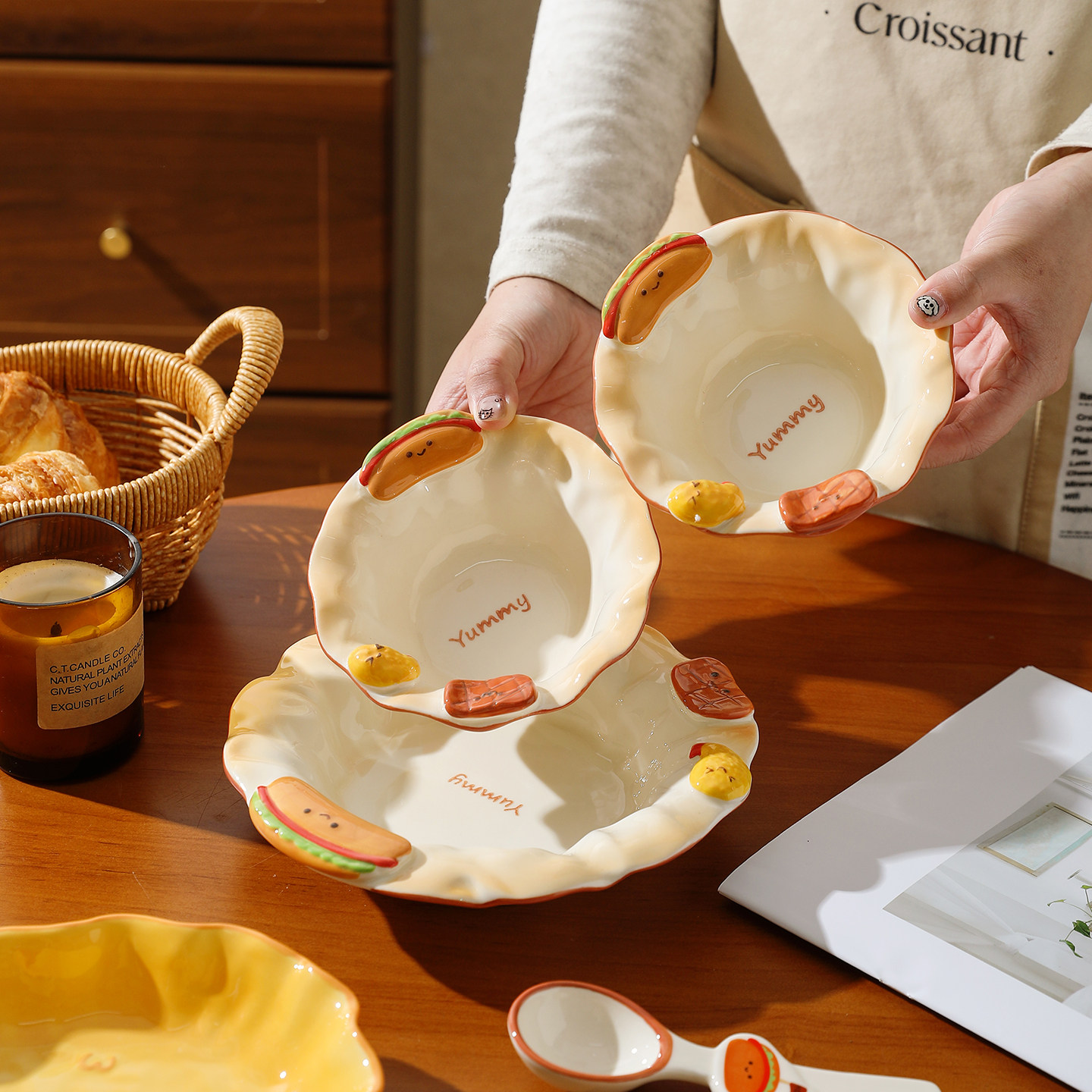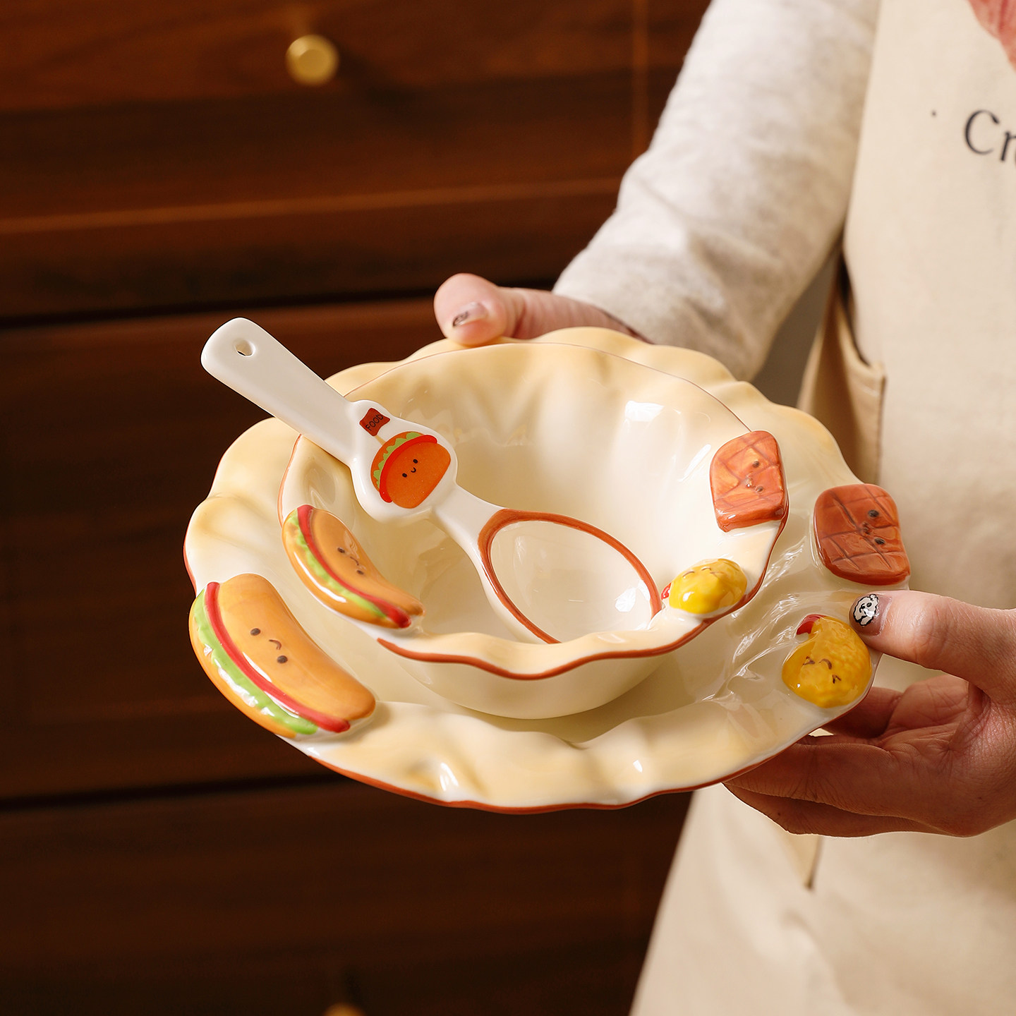 奶油风陶瓷碗家用卡通菜盘子可爱米饭碗汤碗釉下彩儿童餐具耐高温