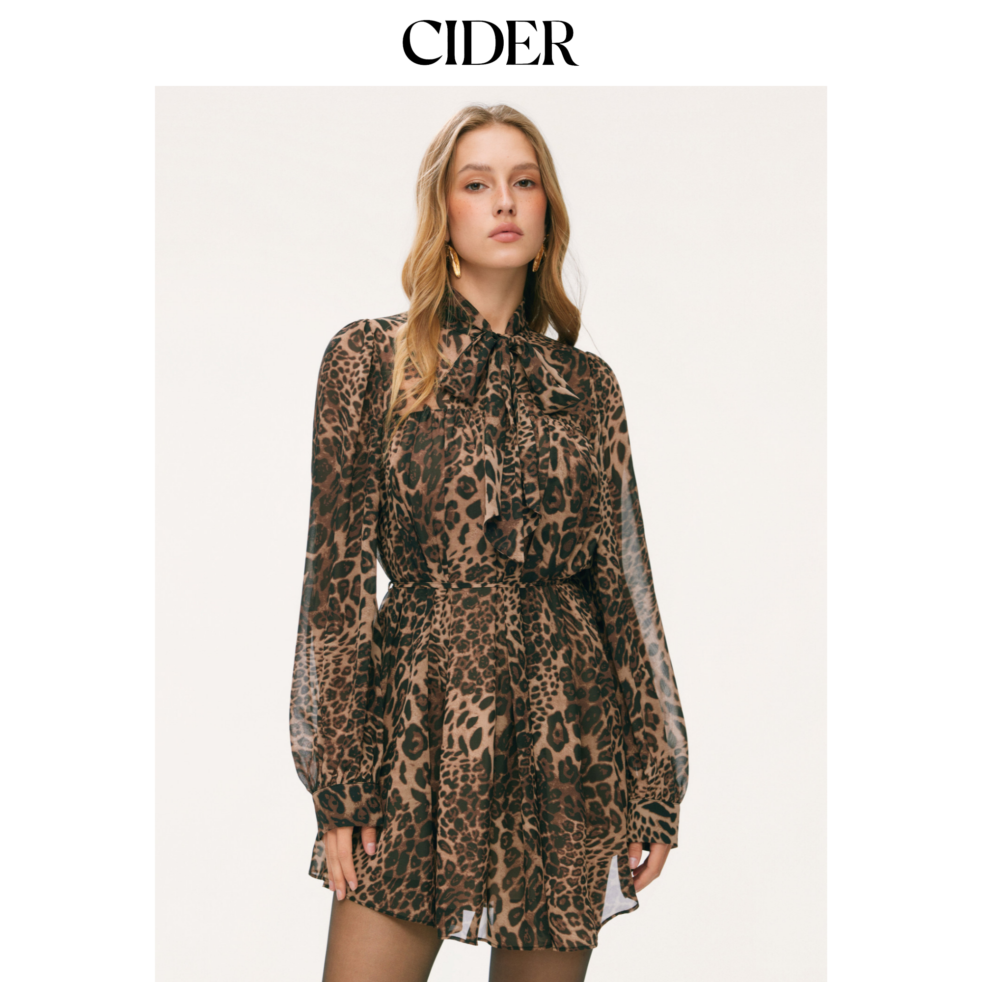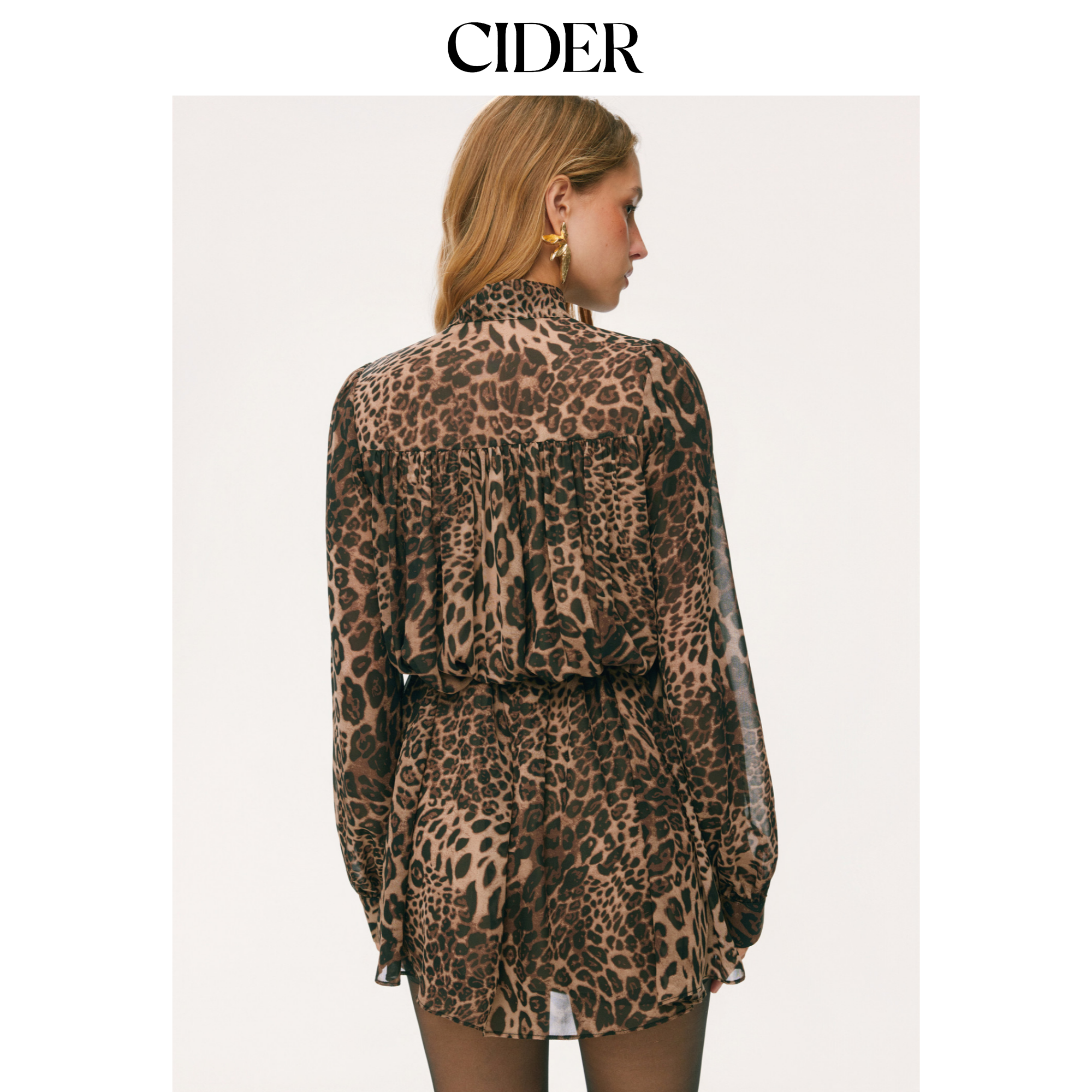 CIDER雪纺豹纹翻领荷叶边宽松迷你连衣裙115041050