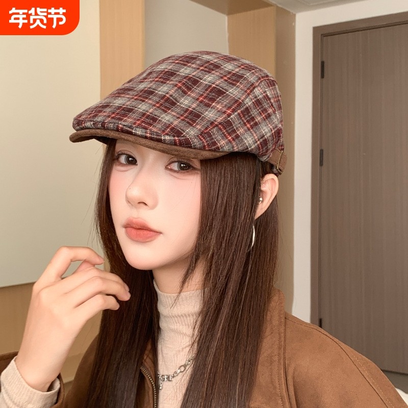 日系复古格纹前进帽子女秋冬季百搭显脸小贝雷帽画家帽鸭舌帽格子
