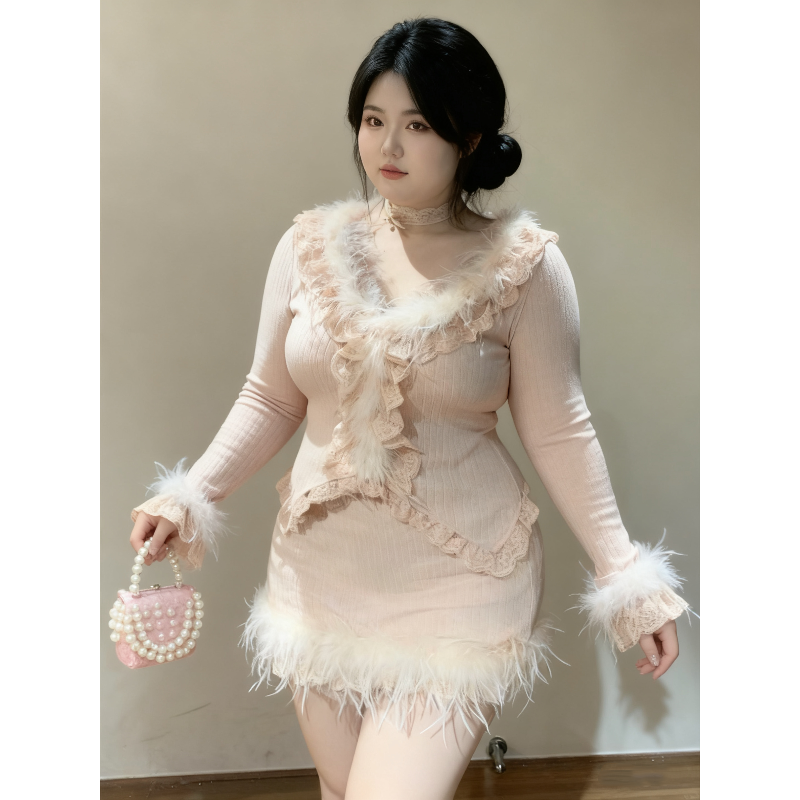 【落樱雨季】芭蕾少女大码纯欲风甜美毛领修身上衣包臀裙粉色套装