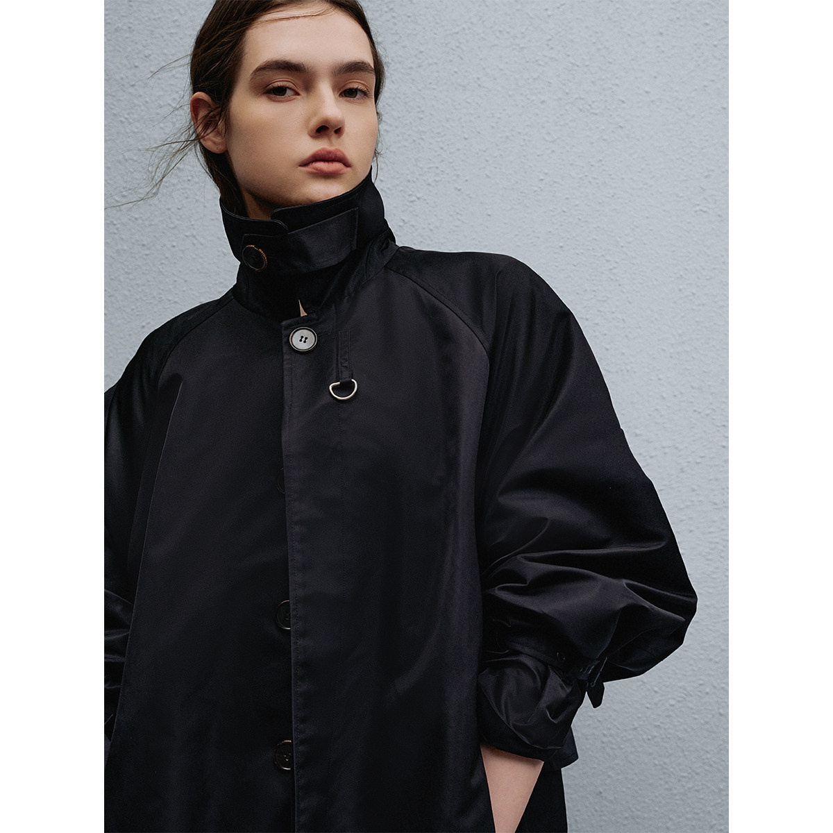 翻领领型,隐藏纽扣门襟,插肩袖设计