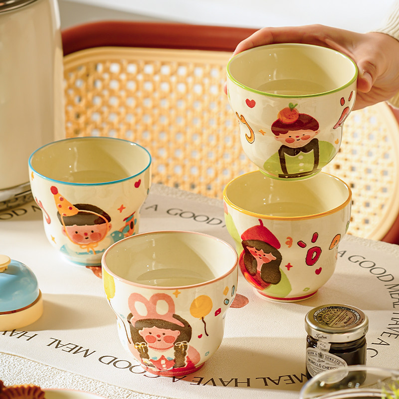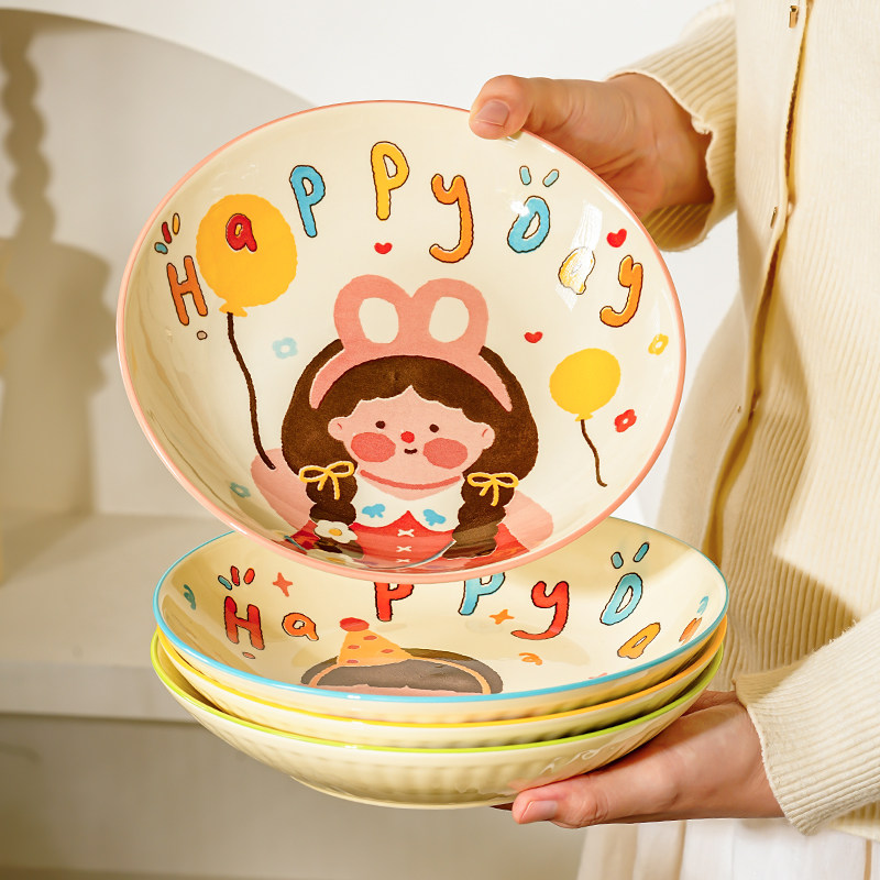 奶油风陶瓷碗家用卡通菜盘子可爱米饭碗汤碗釉下彩儿童餐具耐高温