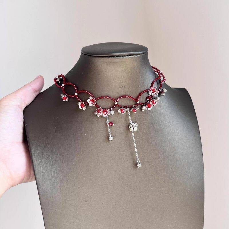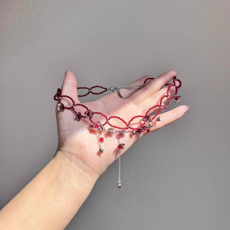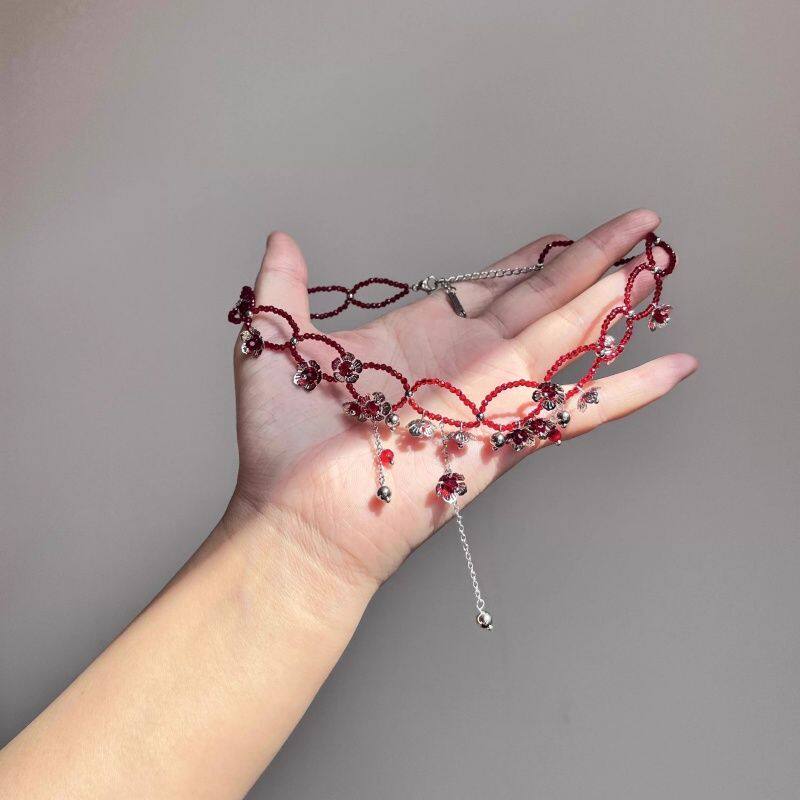 炽热火焰!复古红色串珠银色花朵项链女款设计感锁骨链choker颈链