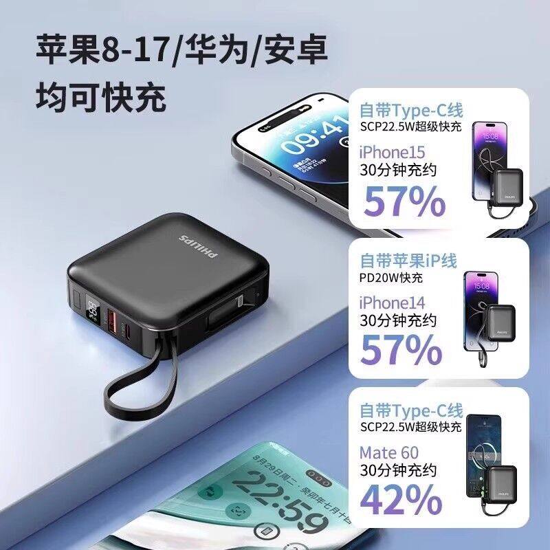 【充电宝3c认证可上飞机】飞利浦2026新款充电宝快充大容量自带双线快充小巧便携10000mAh口袋版适用苹果17