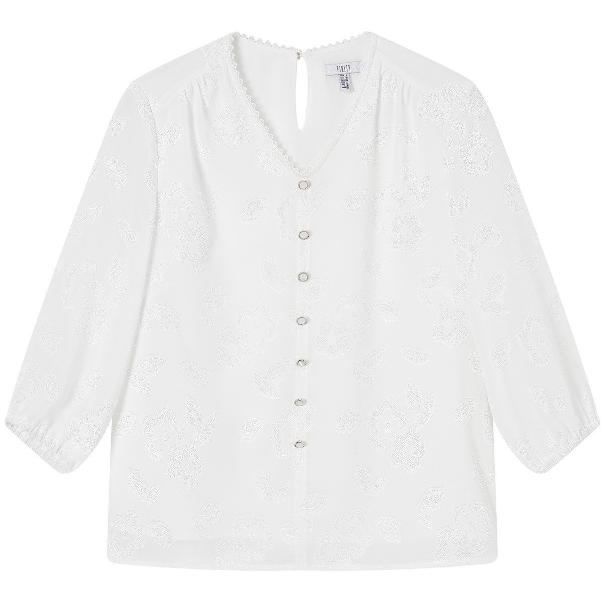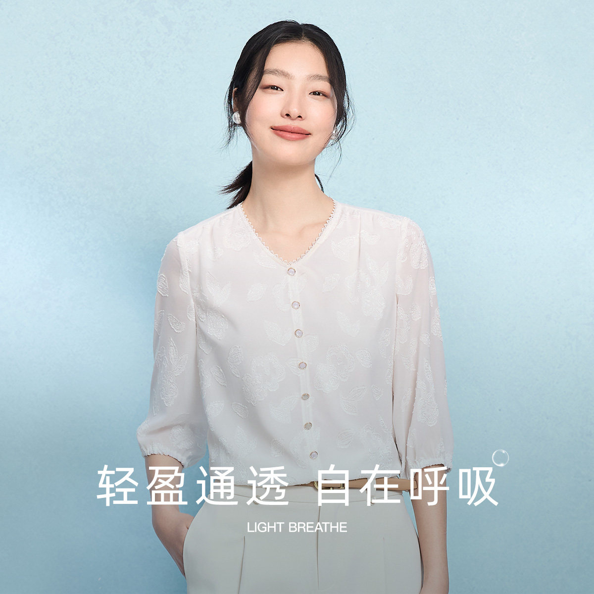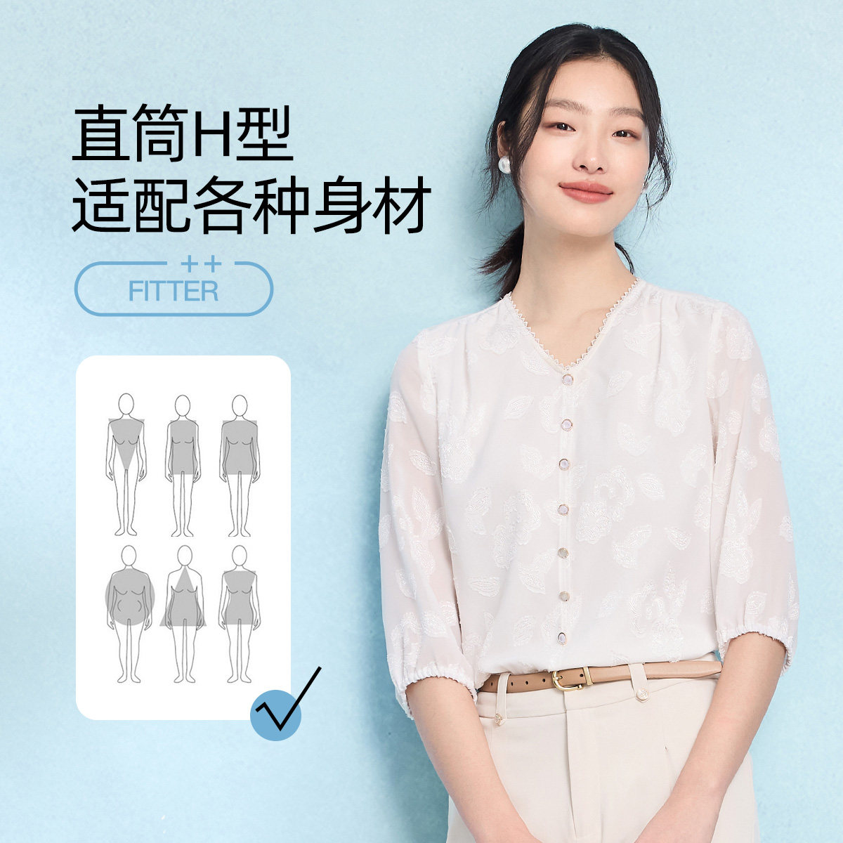 FINITY菲妮迪雪纺衫2025秋新款简约V领抽褶七分袖上衣女