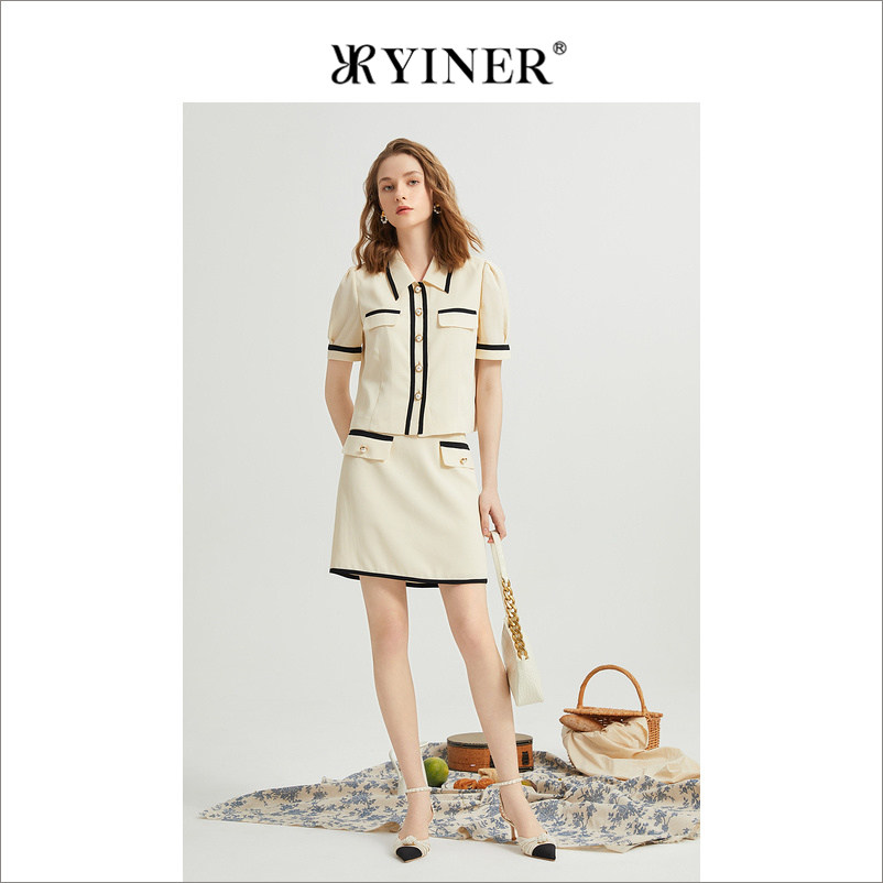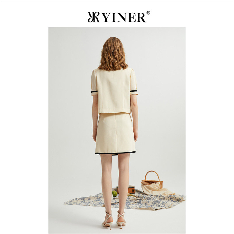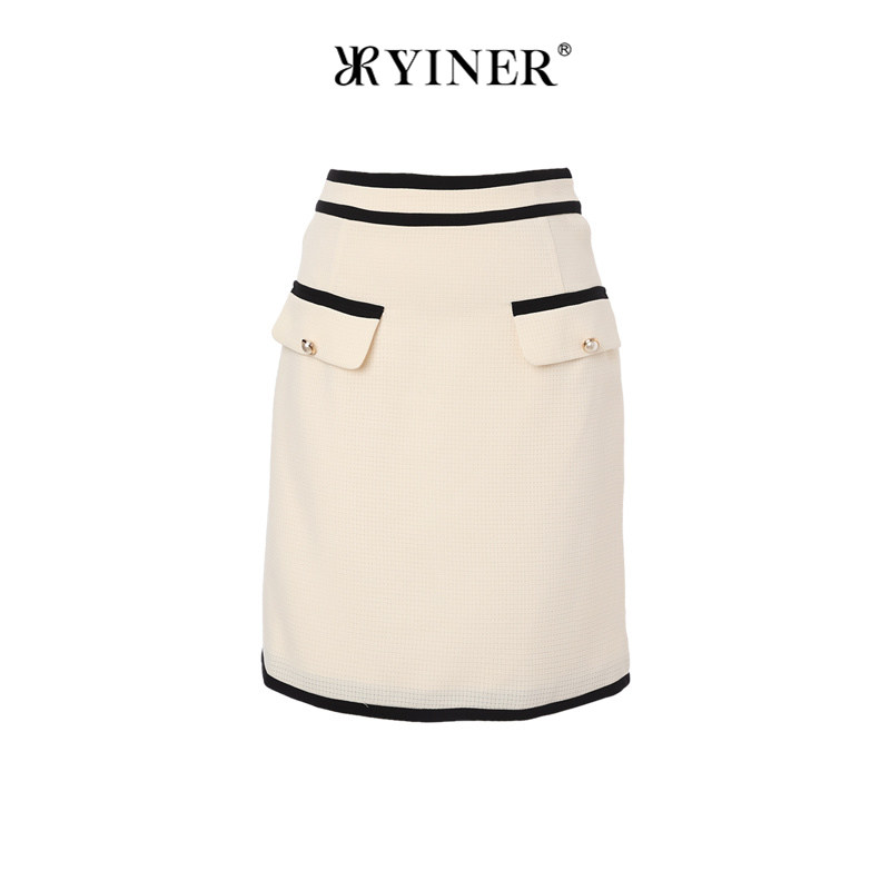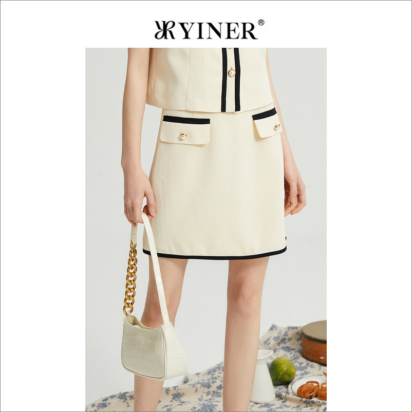 YINER音儿女装夏季时尚通勤撞色线条细格纹半身裙