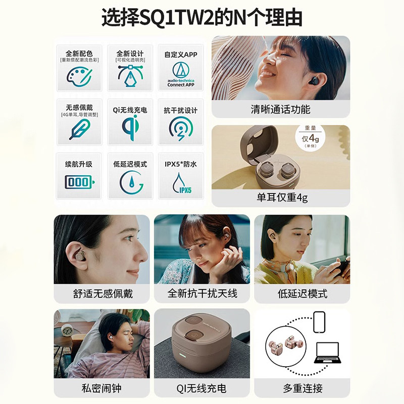 铁三角SQ1TW2蓝牙耳机真无线入耳式新款运动游戏耳麦适用华为苹果