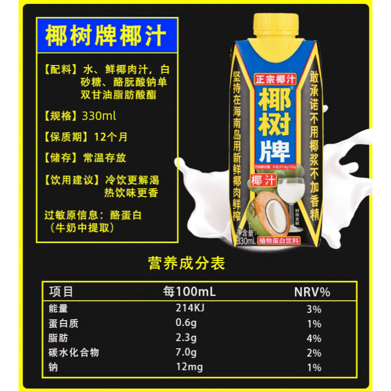 12月产海南正宗椰树牌椰汁天然植物饮料330ml*12盒椰子汁生榨整箱