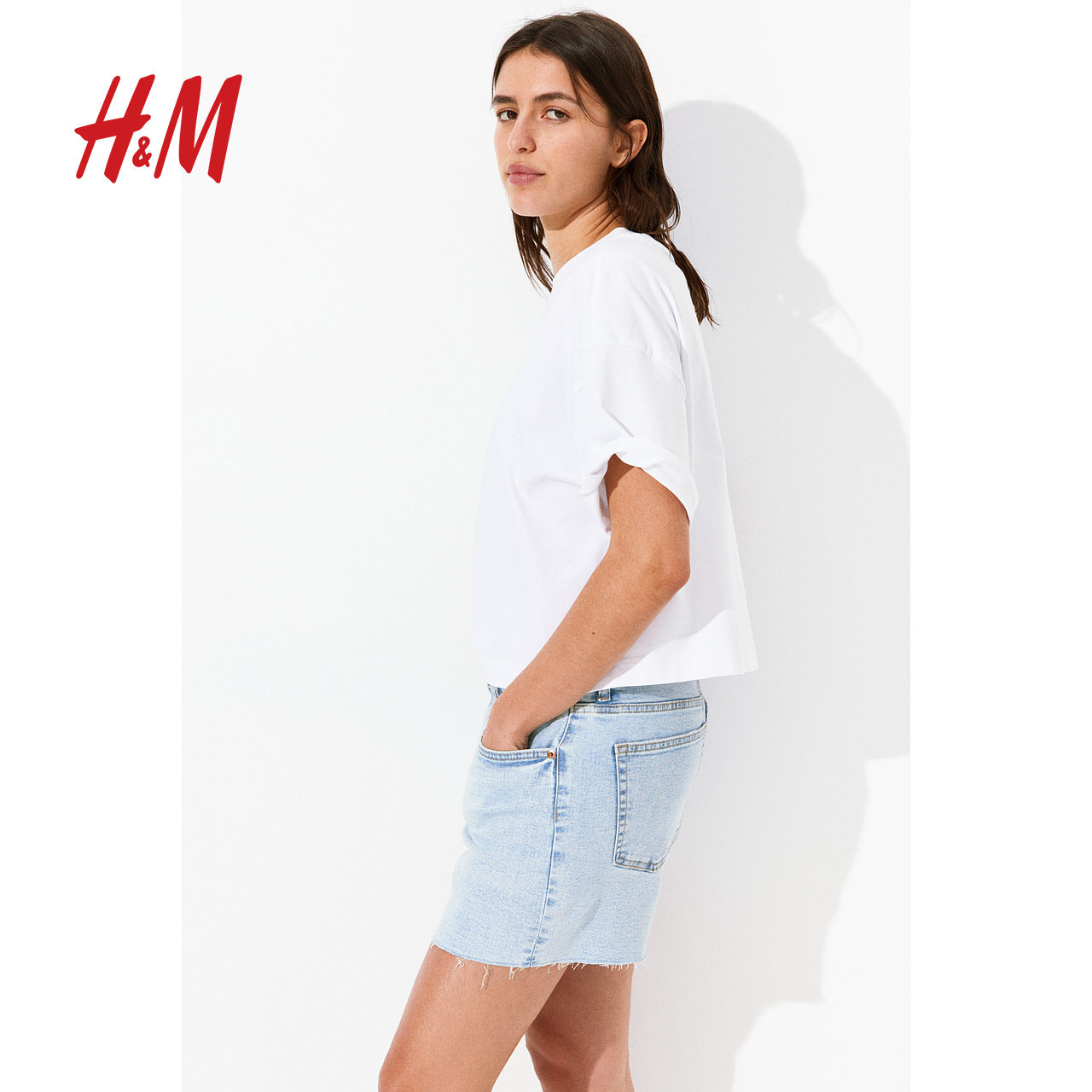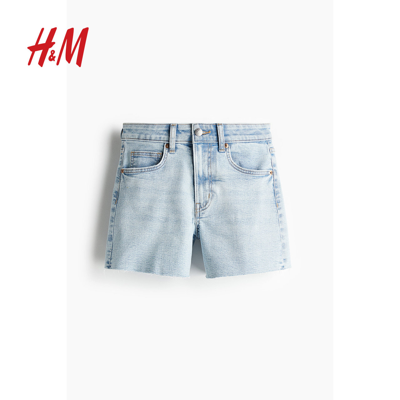 HM女装牛仔裤冬季高腰直筒潮流休闲毛边慵懒时髦辣妹短裤1220489
