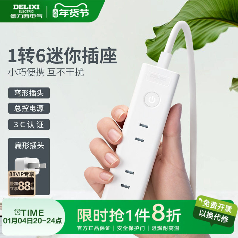 德力西迷你插座两脚插头二孔一转六电源转换器排插两插板扩展插排