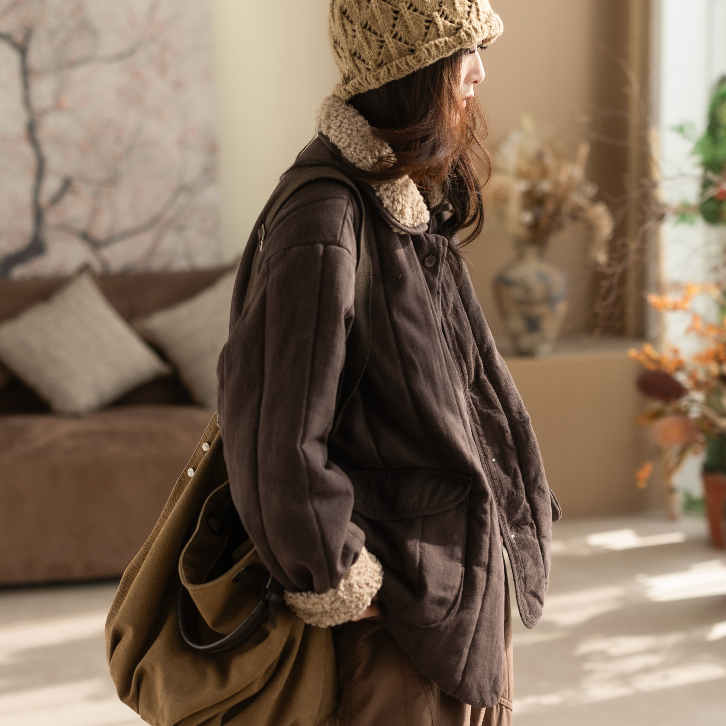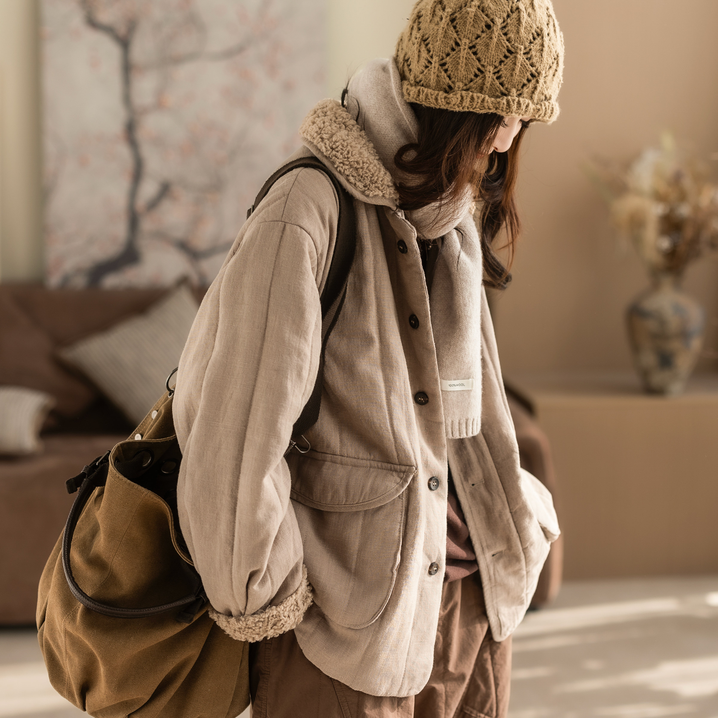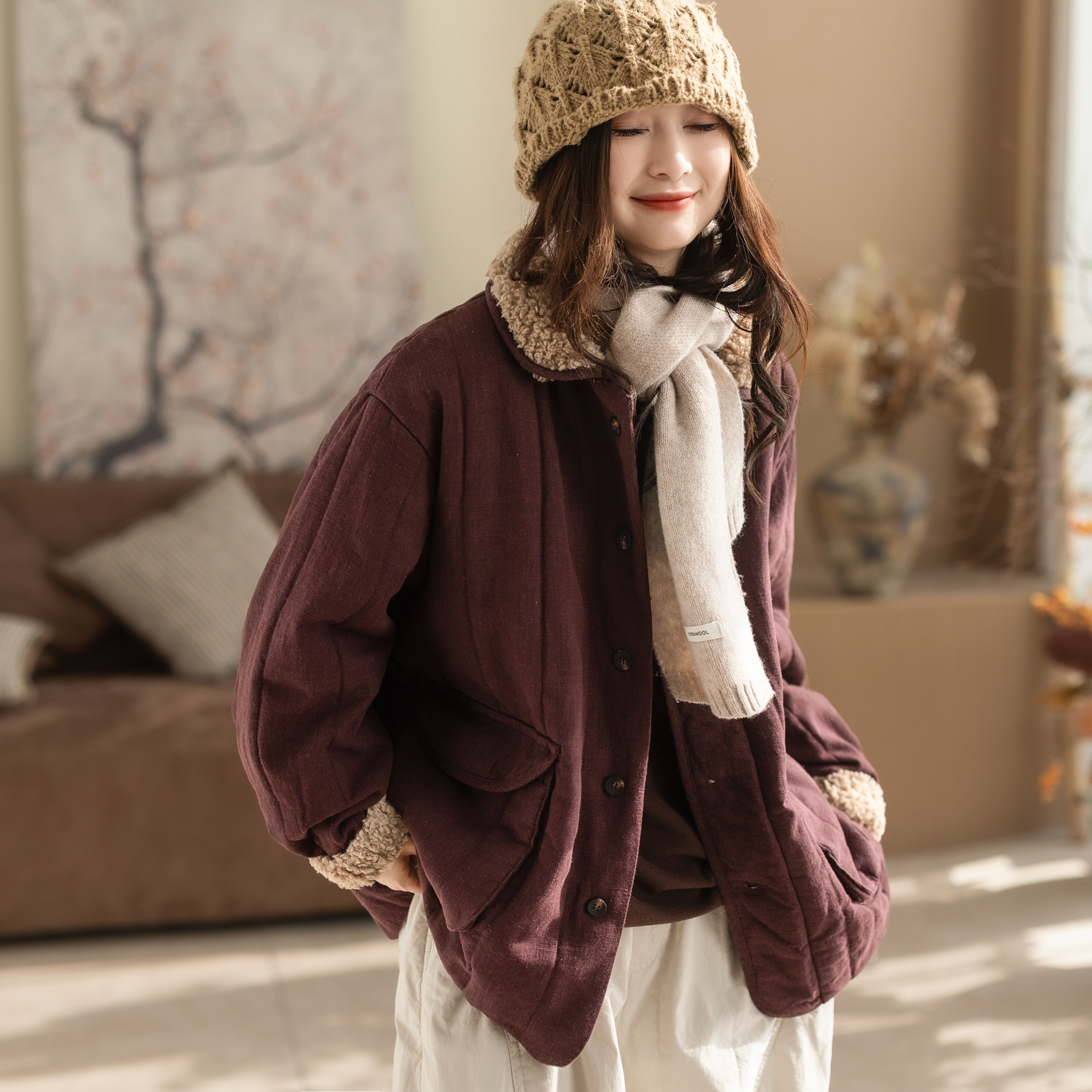咖咪羽棉服女冬装新款女士70%苎麻休闲天丝百搭夹棉洋气女装上衣