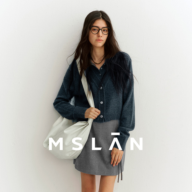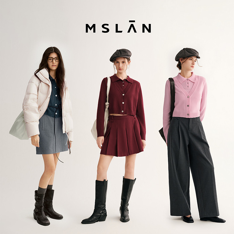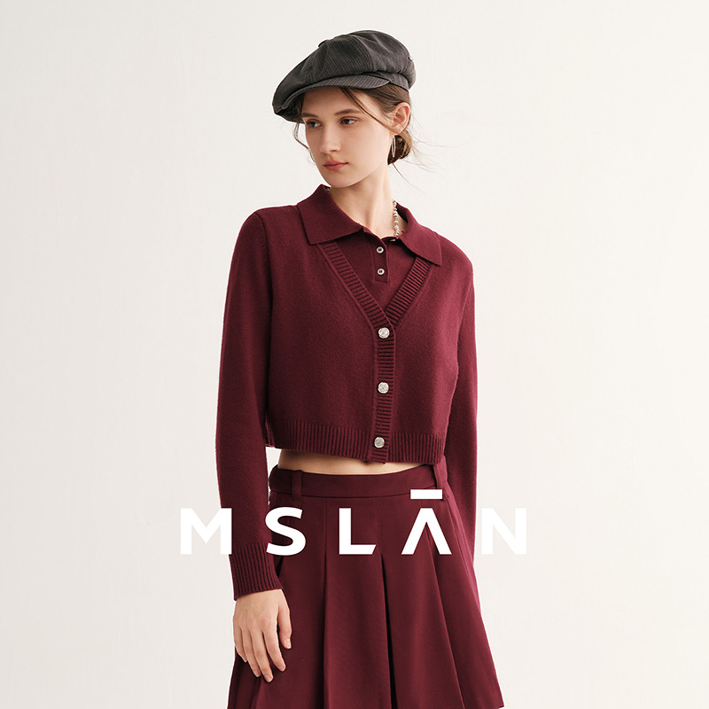 高智感/MSLAN安可拉红 全羊毛翻领假两件针织衫V领套头红色毛衣