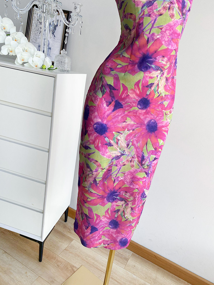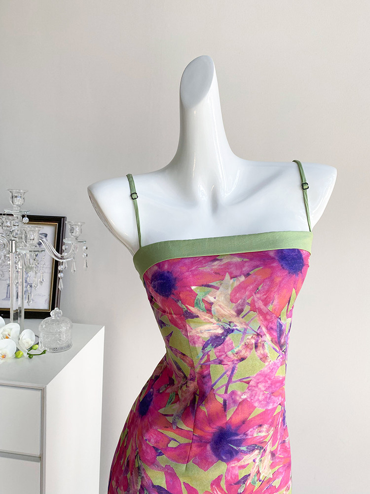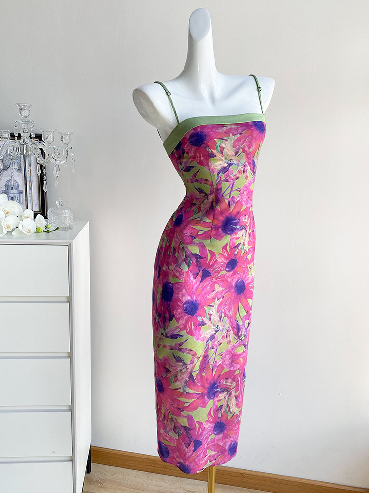 法式复古油画连衣裙女夏季长裙高级感气质赫本风包臀吊带礼服裙子