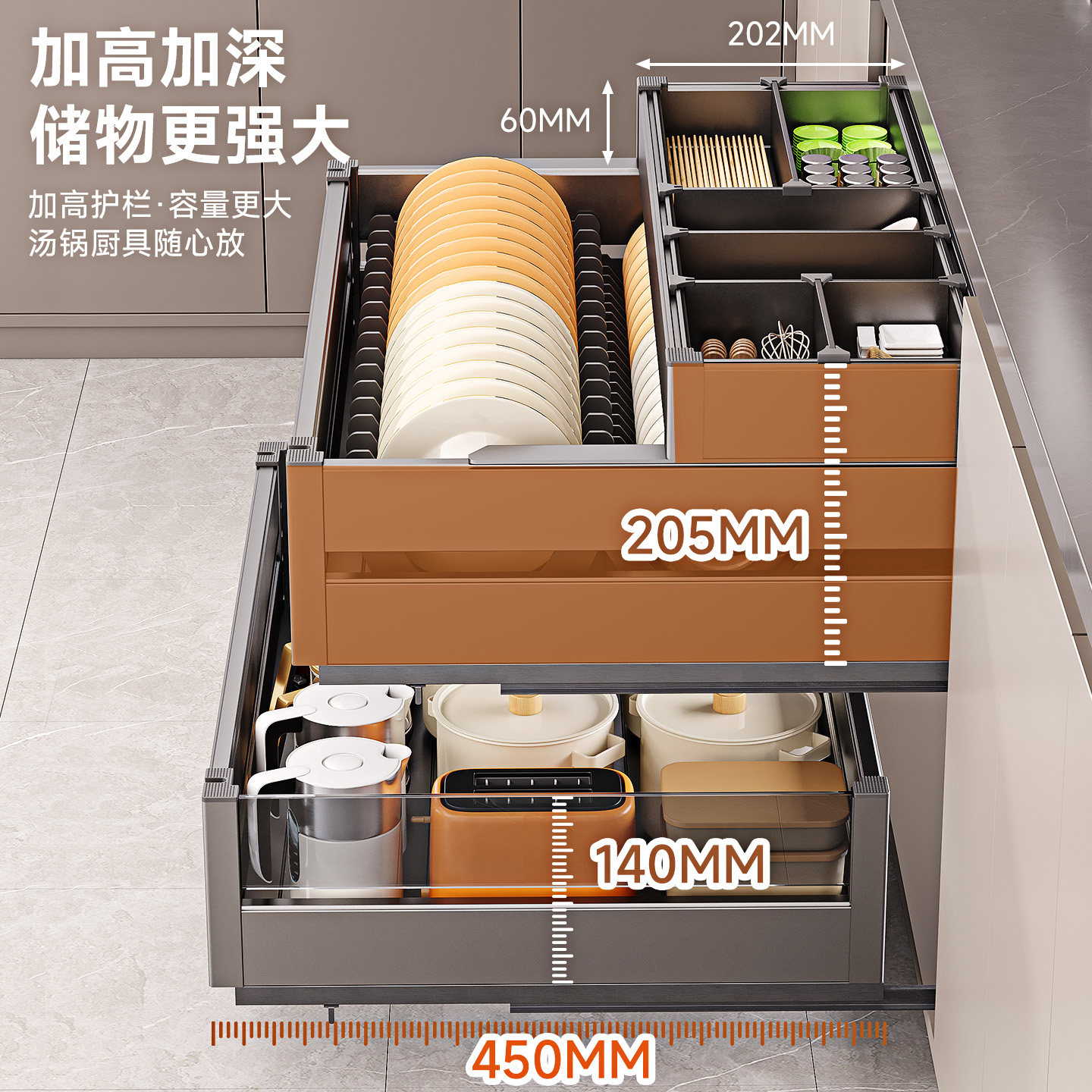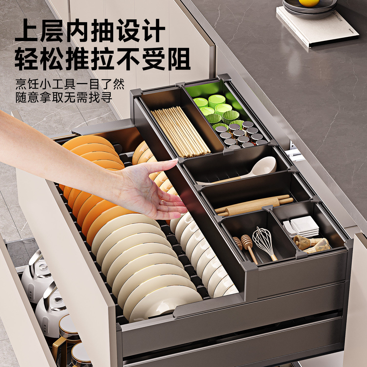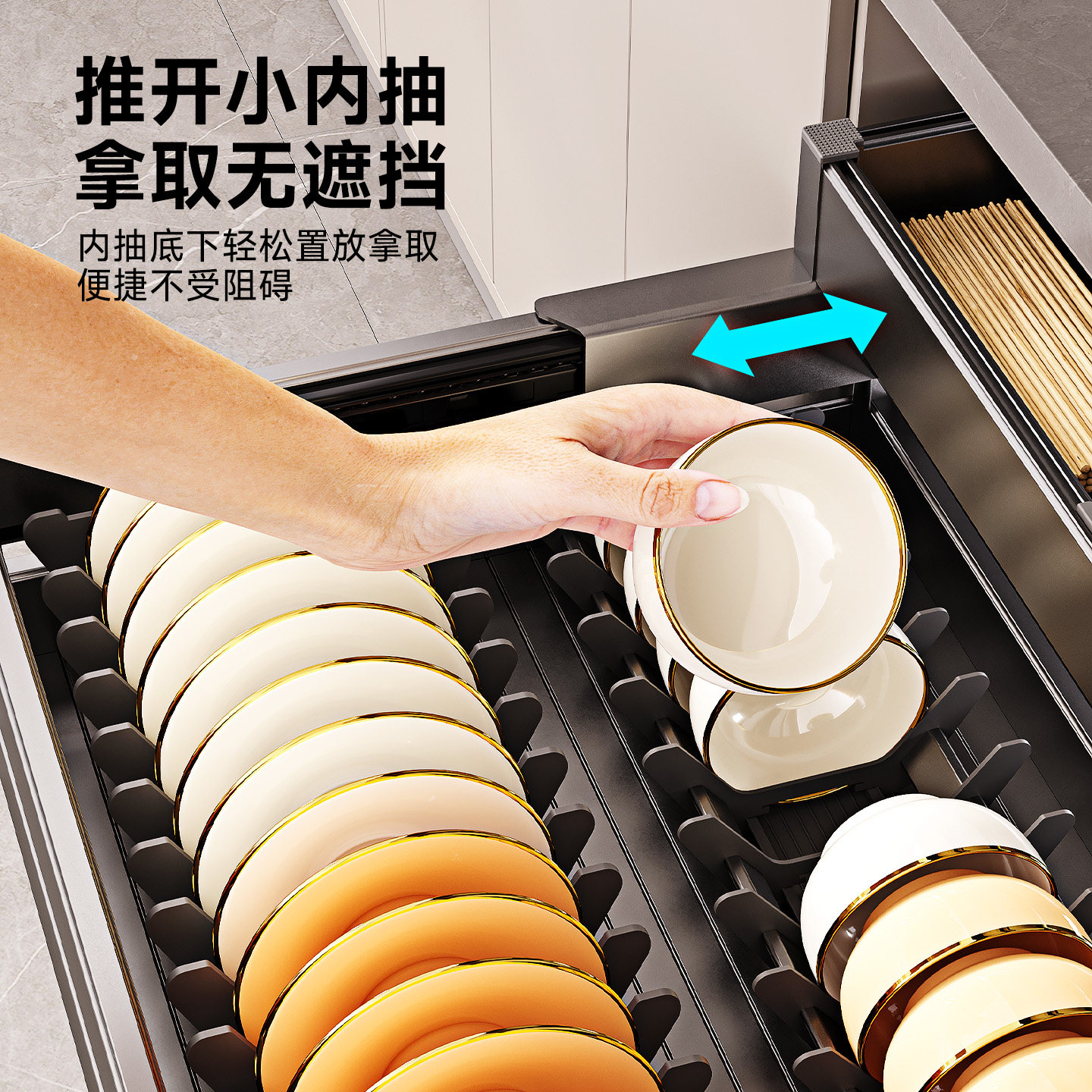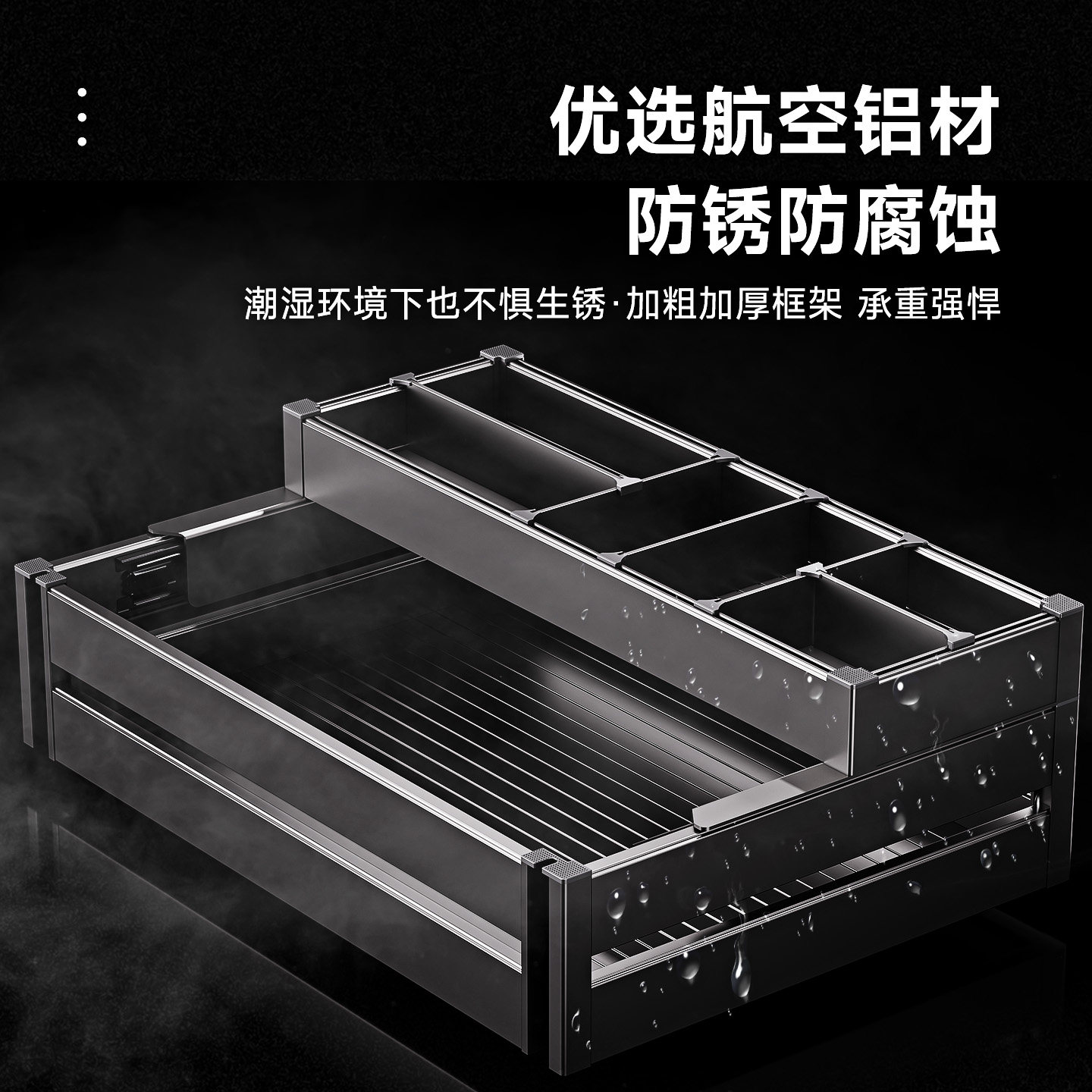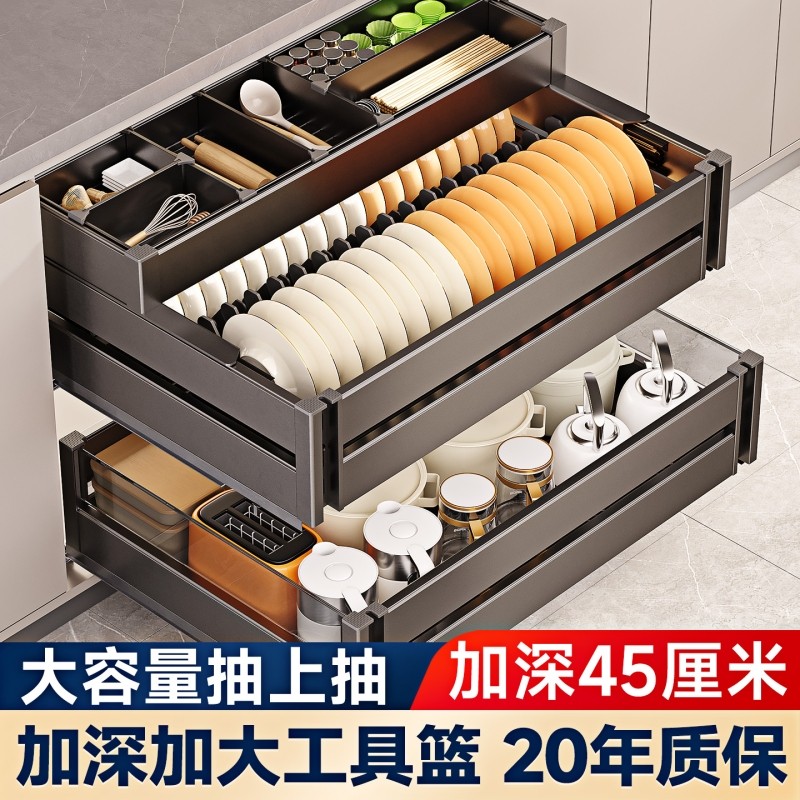 拉篮厨房橱柜碗架内置铝合金双层抽中抽屉式三层厨柜碗碟收纳碗篮