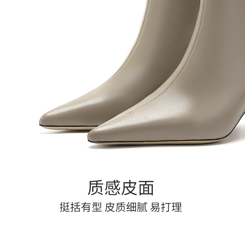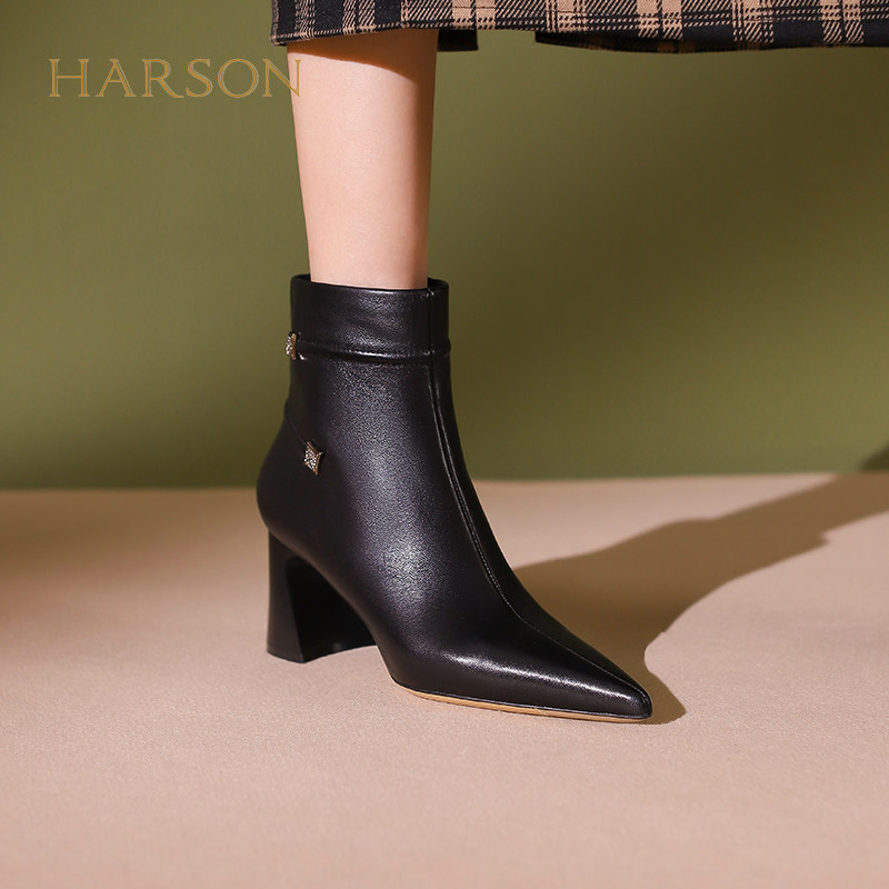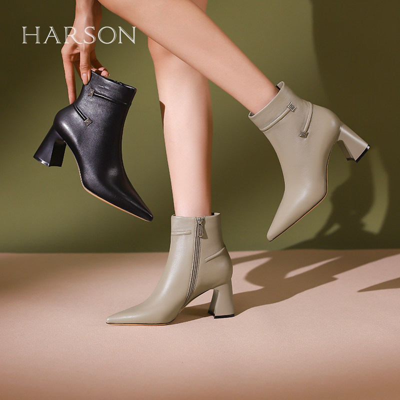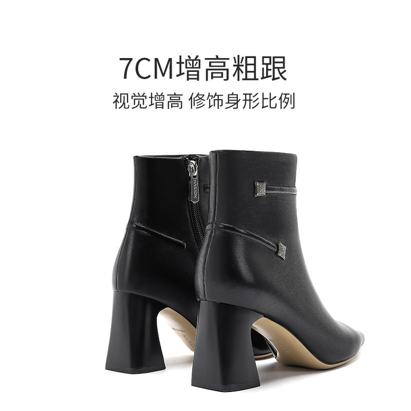 哈森冬季新款时尚百搭尖头粗跟短靴短筒时装靴休闲HWA230106