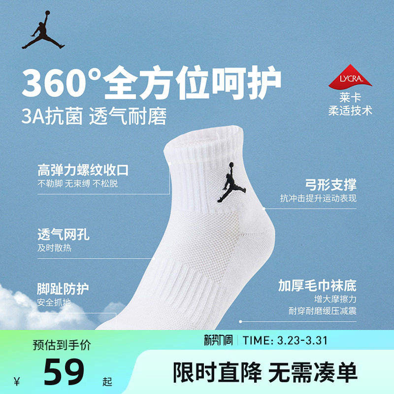 【3双装】Jordan男童女童袜子春夏新款儿童运动袜透气中大童中袜