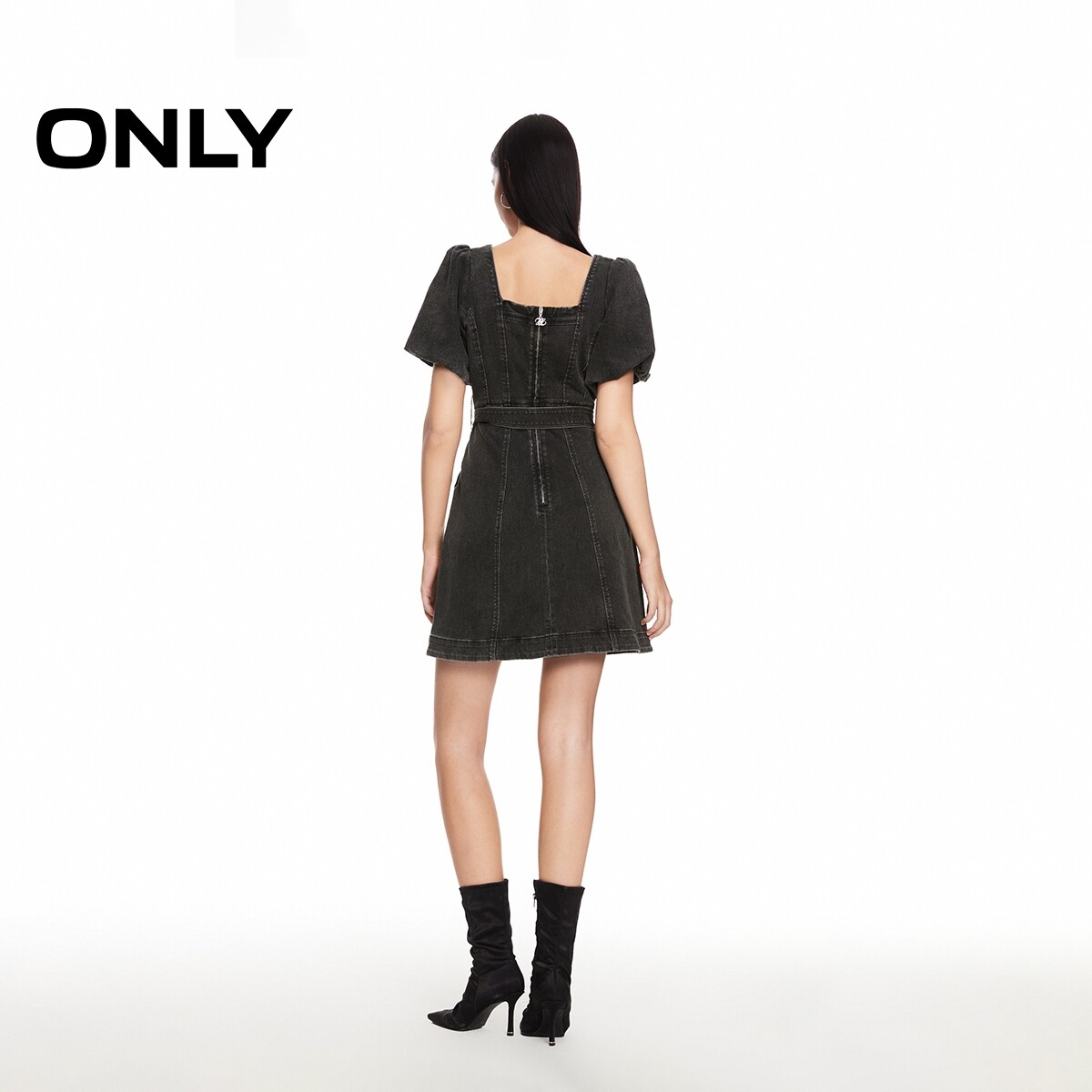 【ONLY奥莱】春夏复古莱卡泡泡袖烫钻装饰方领短裙牛仔连衣裙女