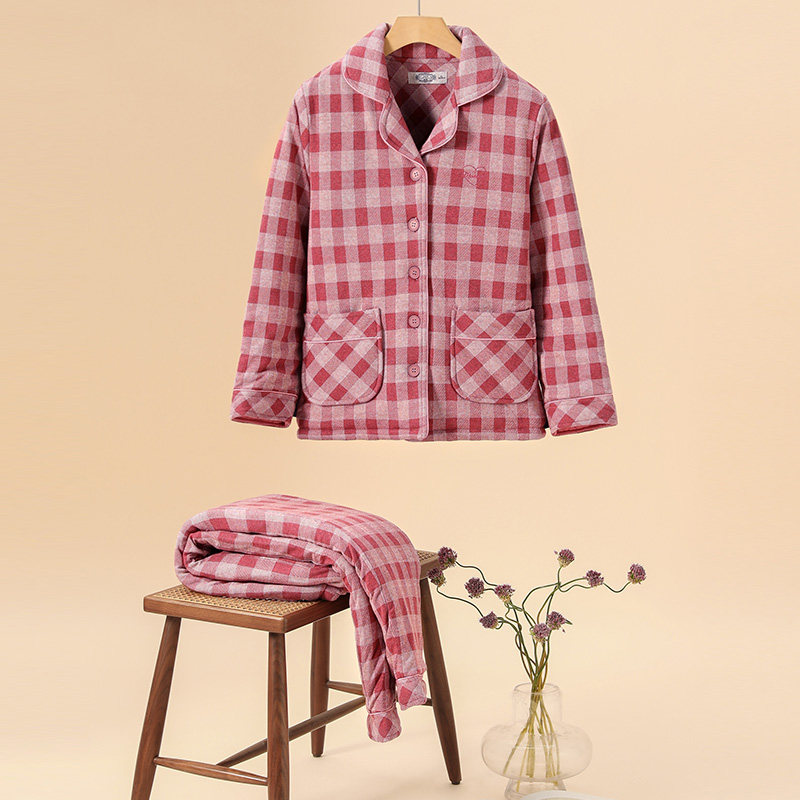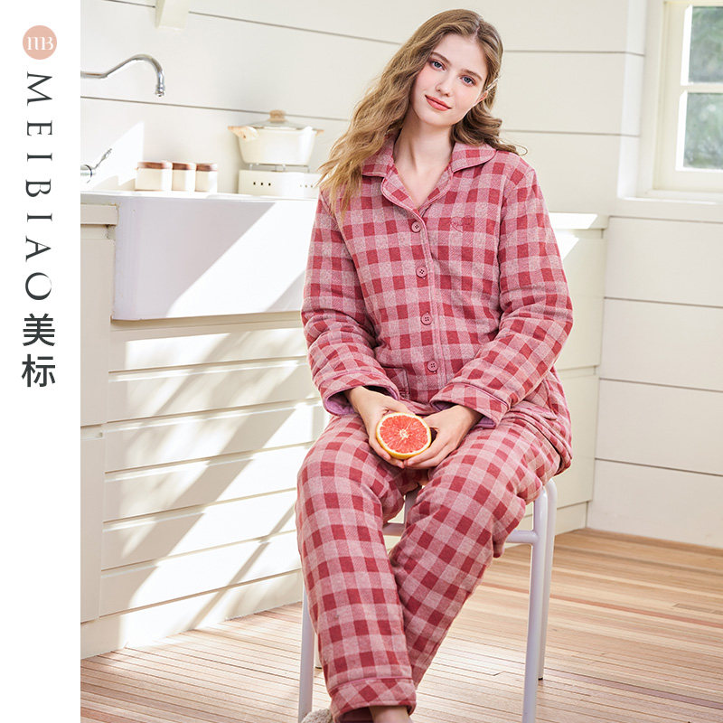 美标情侣三层加厚保暖夹棉睡衣套装女秋冬休闲格子可外穿家居服男