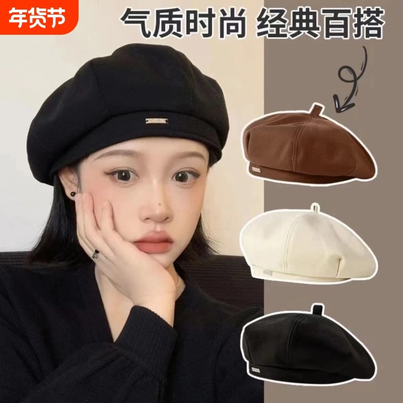 黑色贝雷帽女秋冬款2025新款ins画家帽显脸小八角帽子大头围秋冬