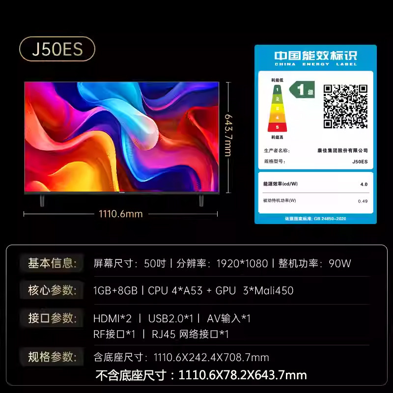 康佳50英寸J50ES新1级能效电视机超高清智能网络wifi平板液晶家用