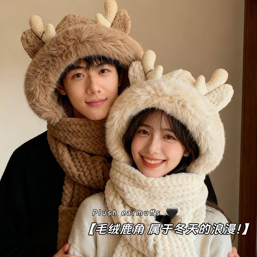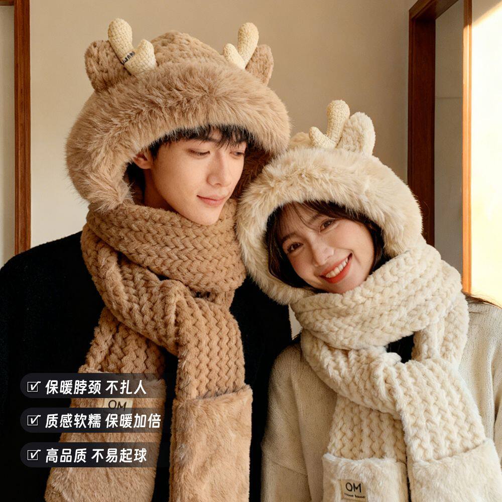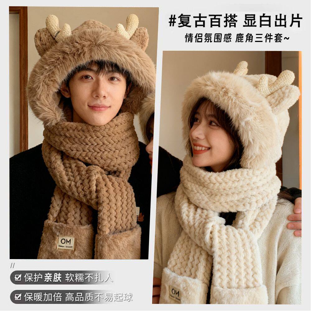 情侣帽子三件套冬季保暖围巾手套一体加厚围脖可爱毛绒女骑车防风