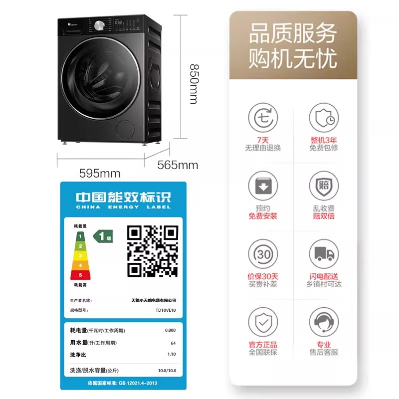 [纯平全嵌]小天鹅小乌梅3.0轻享版 10KG洗烘一体洗衣机TD10VE10