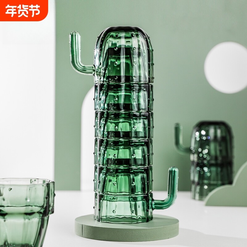 乐唯诗仙人掌玻璃杯原色玻璃杯具套装创意水杯家用茶具墨绿无铅