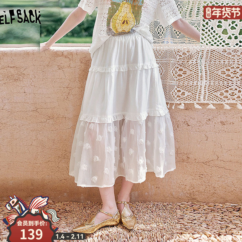 妖精的口袋白色花朵莱赛尔半身裙女2025年夏季新款高腰甜美中长裙