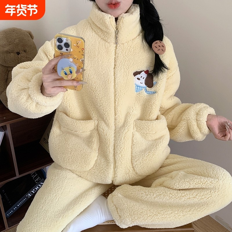 法兰绒睡衣女秋冬款加绒加厚珊瑚绒可爱保暖家居服可外穿外出印花