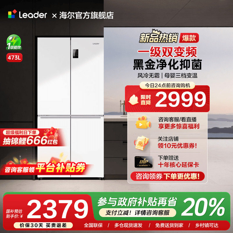 政府补贴海尔出品统帅476L十字对开四门风冷一级大容量家用电冰箱