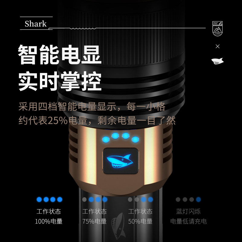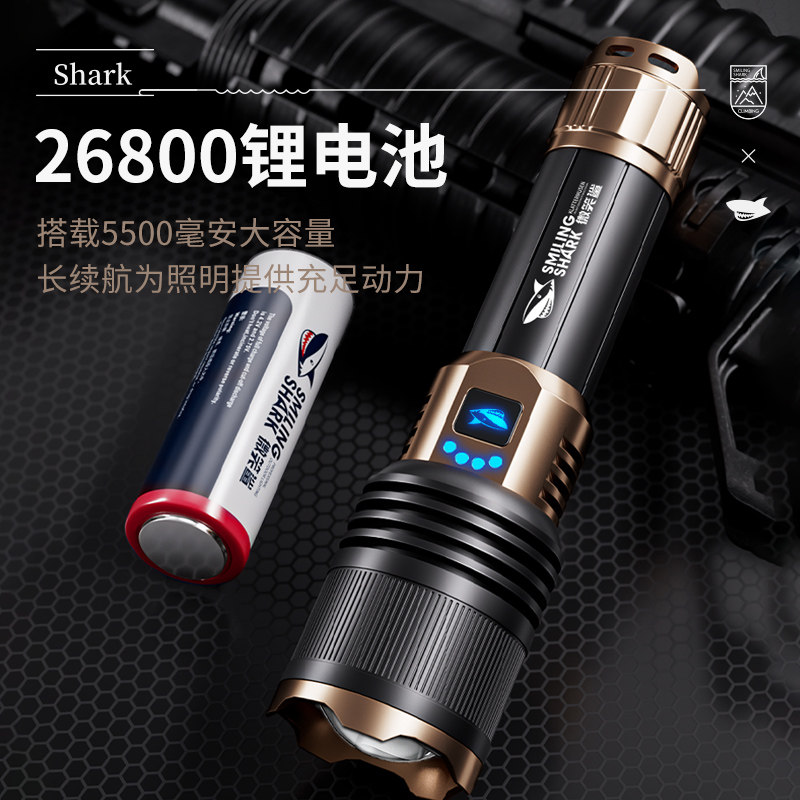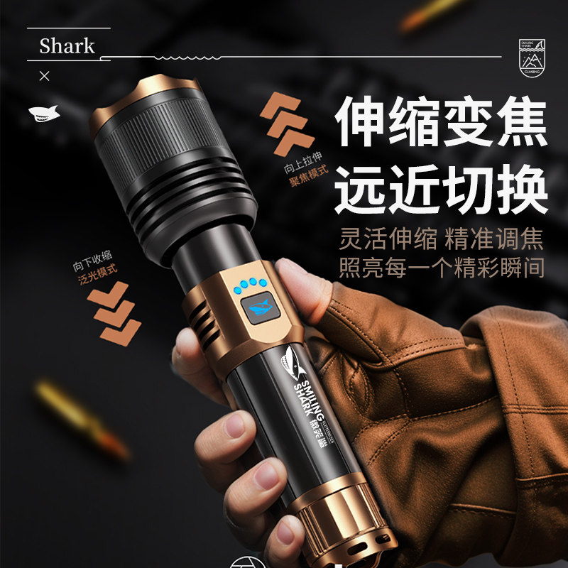 微笑鲨军工强光手电筒充电超亮led激光超长续航大容量户外照明灯