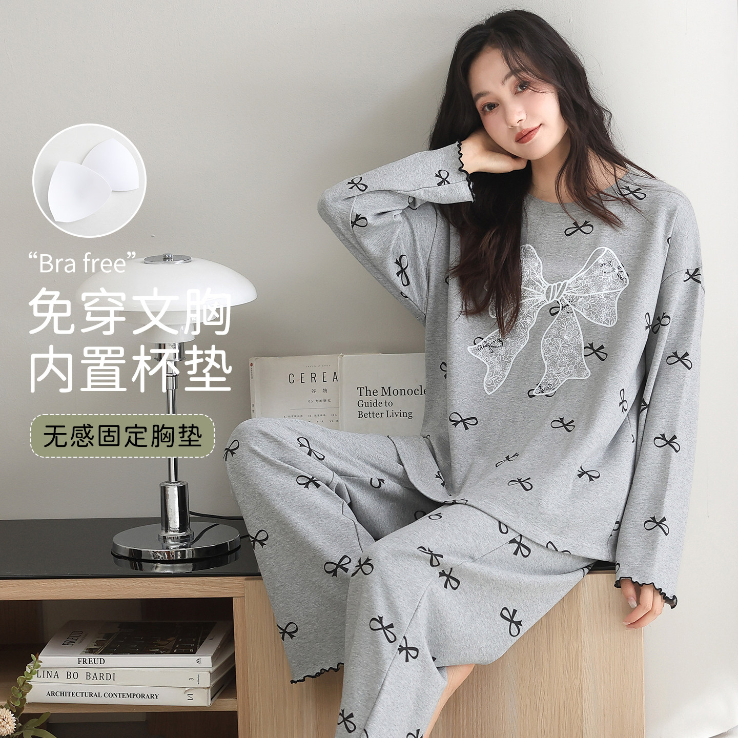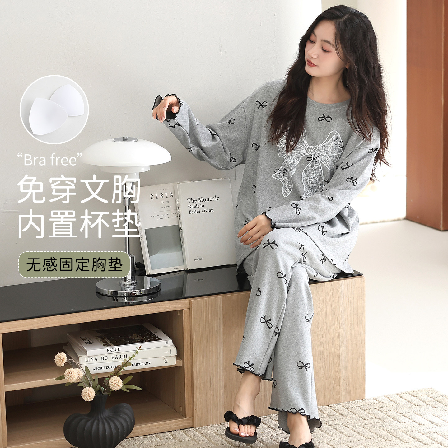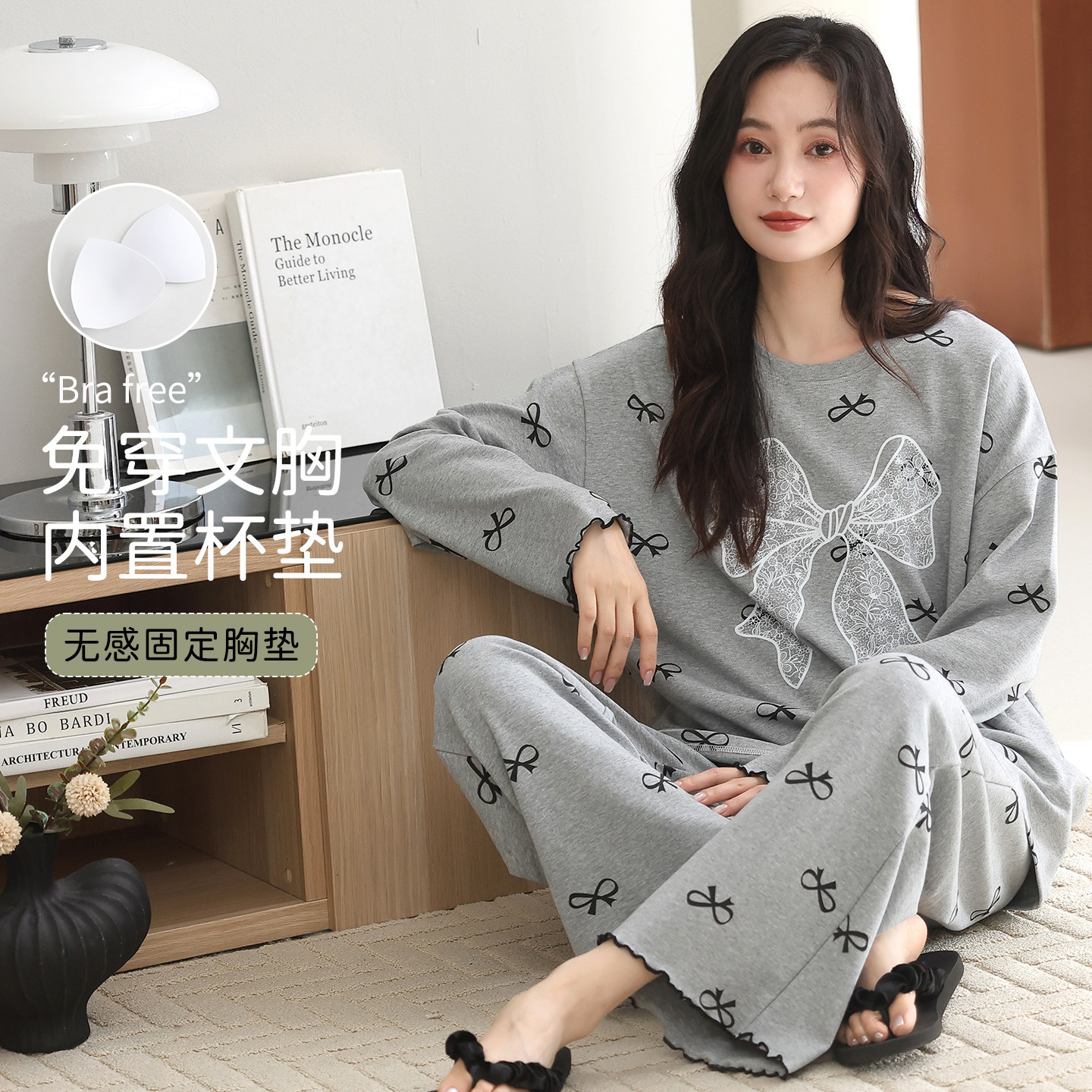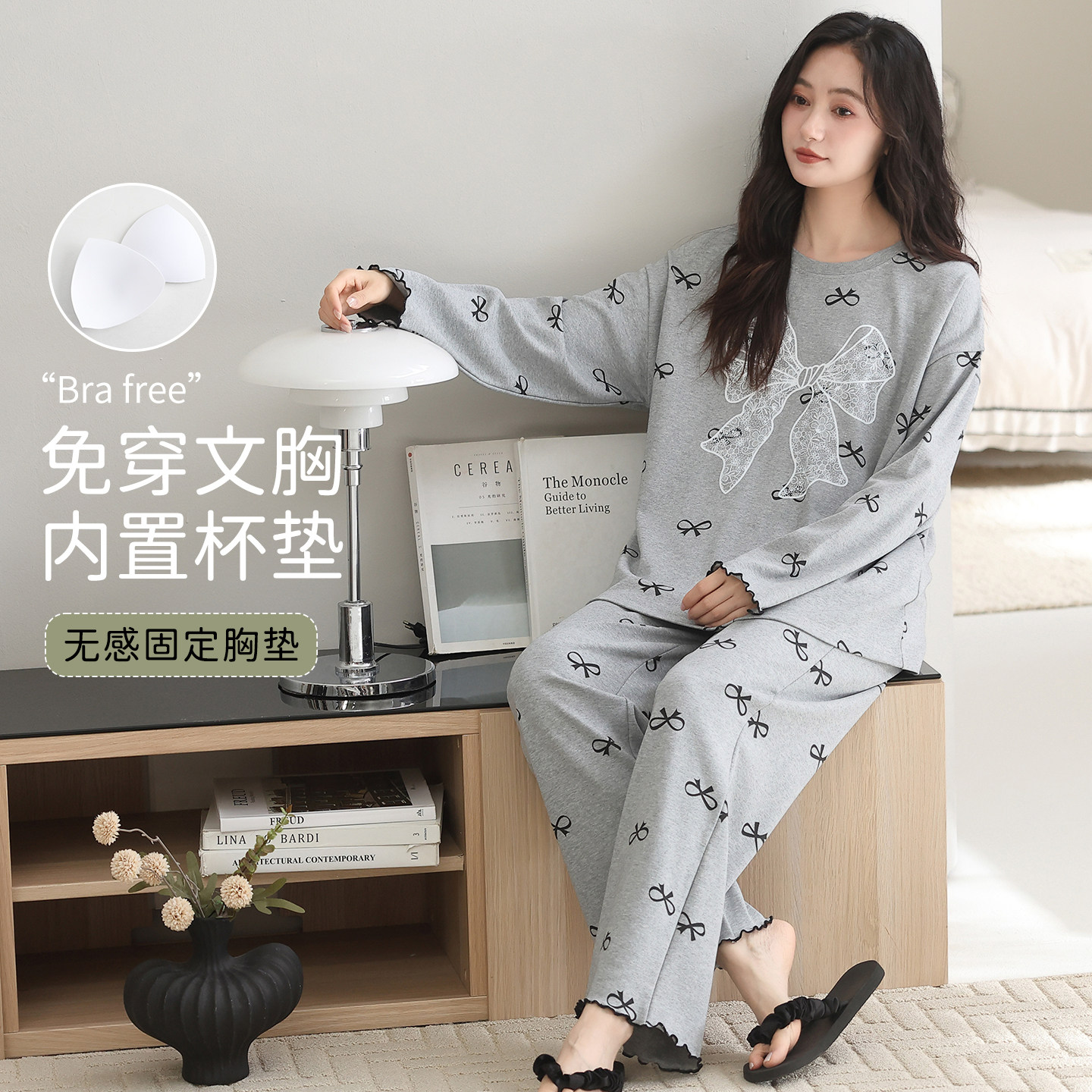 2025年秋冬季带胸垫圆领睡衣女青年灰色蝴蝶甜美长袖可外穿家居服