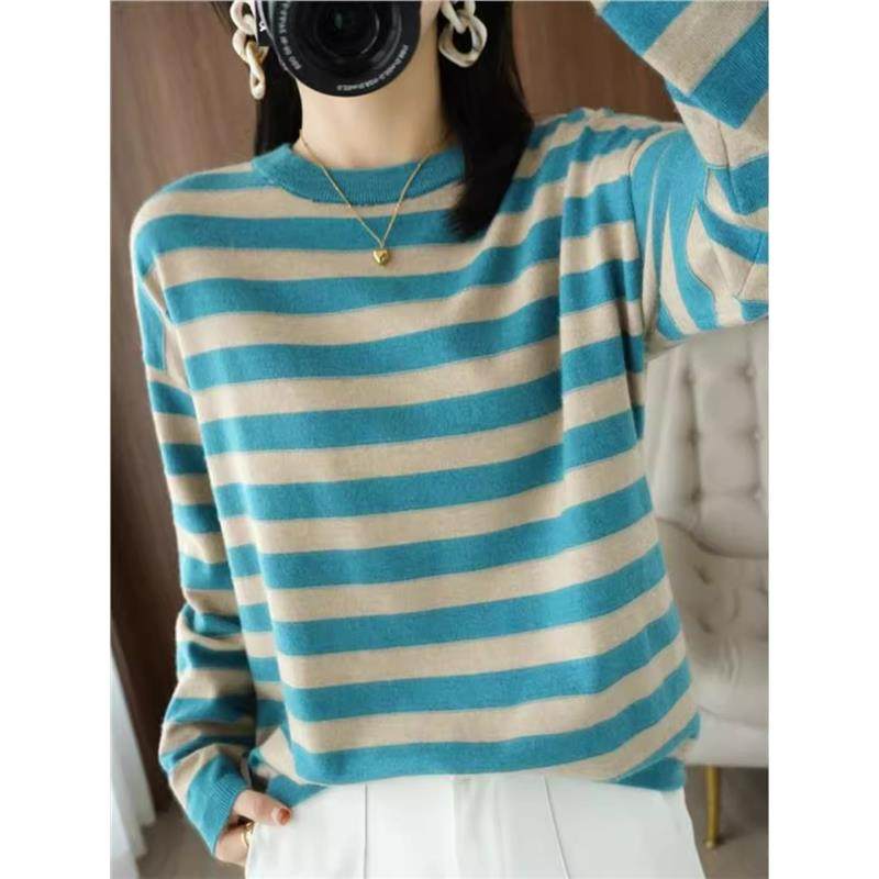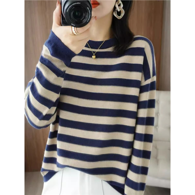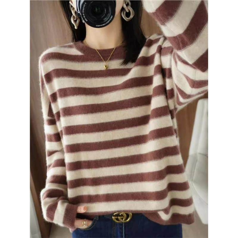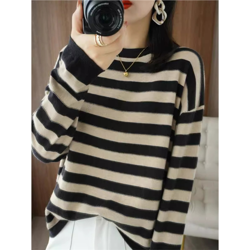 2024秋冬新款羊绒衫条纹黑白长袖针织衫羊毛女宽松洋气上衣毛衣
