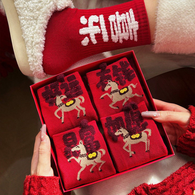 2026年本命年红袜子女款男秋冬中筒袜马年新年属马情侣结婚长筒袜