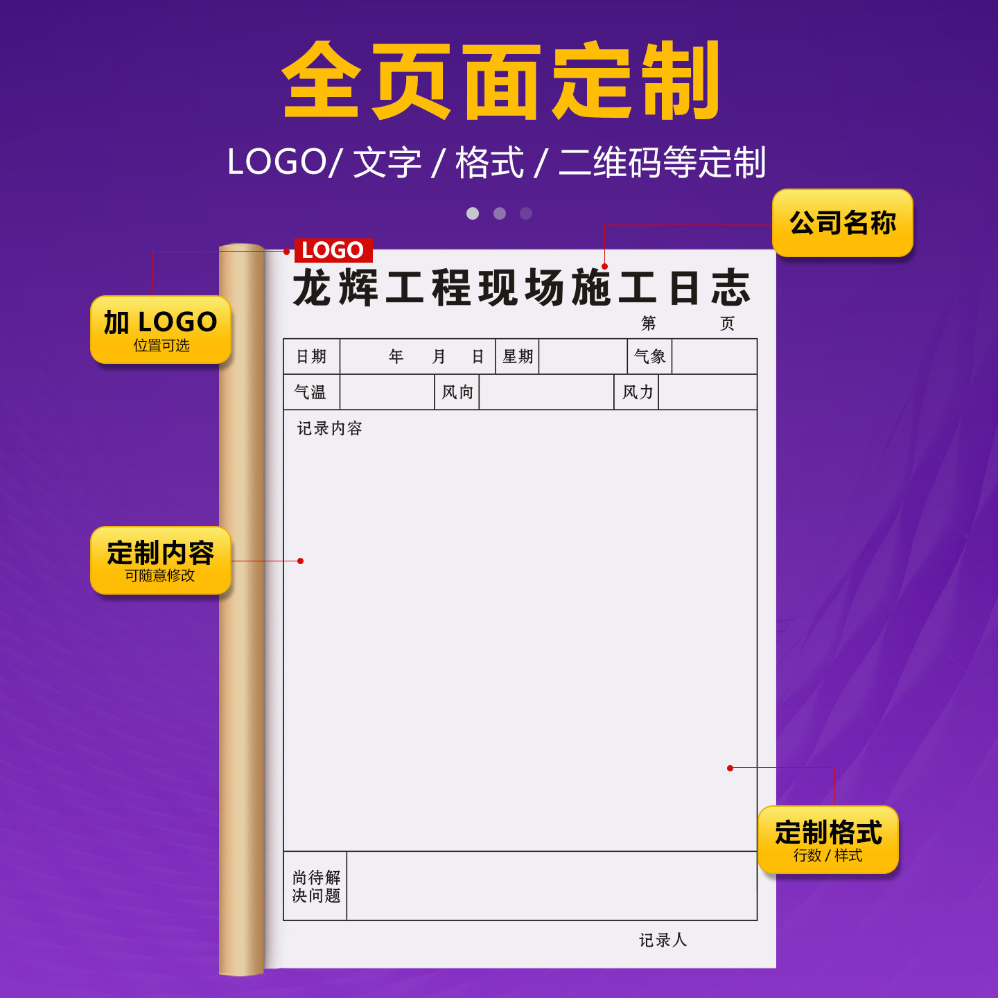 【现场施工日志】定制建筑工地施工质量安全检查监理日志工程项目巡查监督记录本手写项目部施工进度装修手册