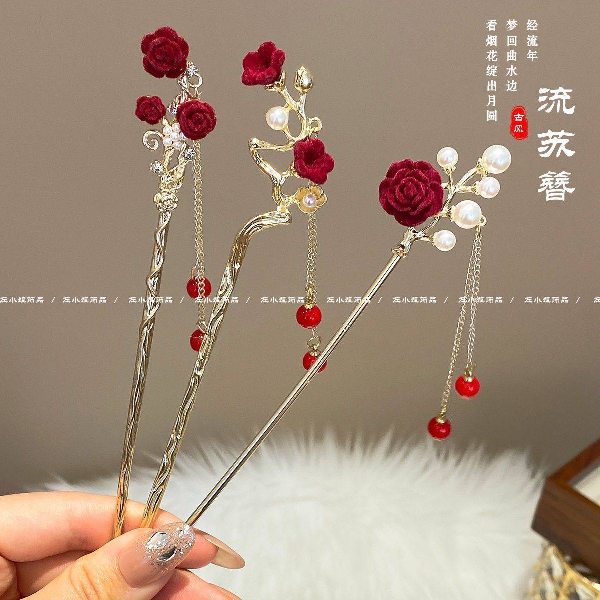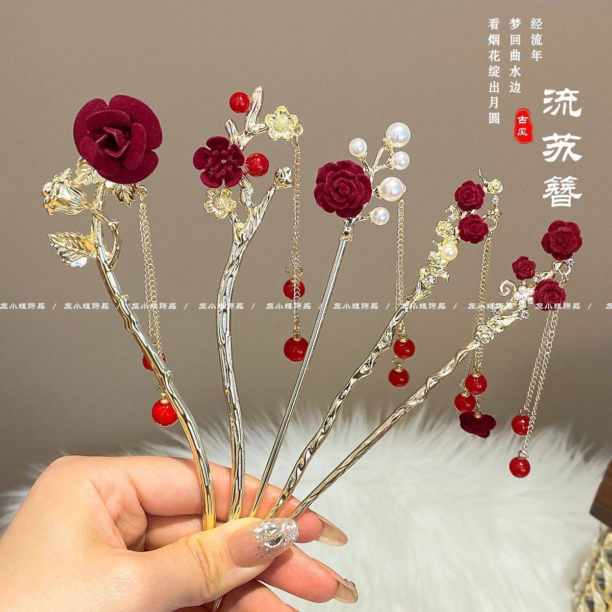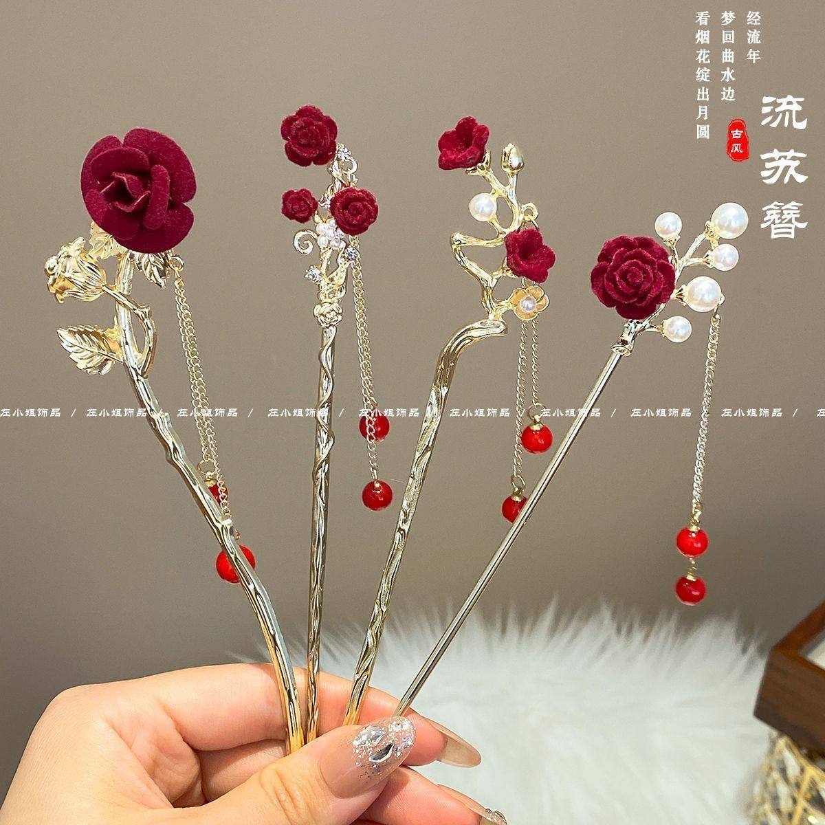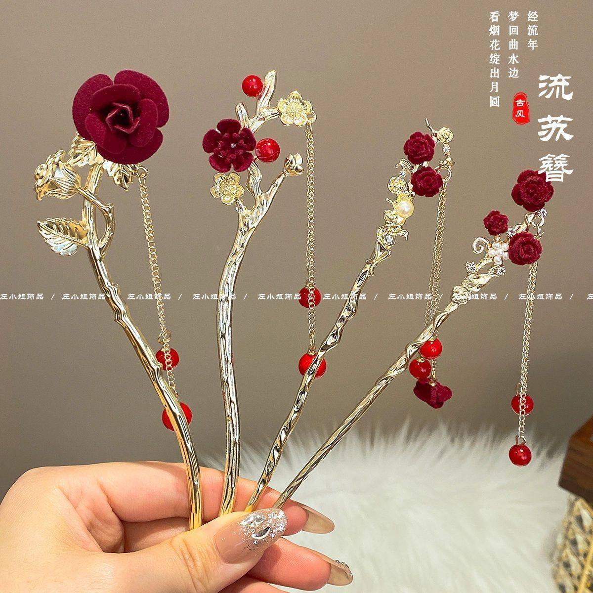 红色花朵流苏发簪女秋冬新中式高级感簪子古风汉服盘发钗盘发头饰