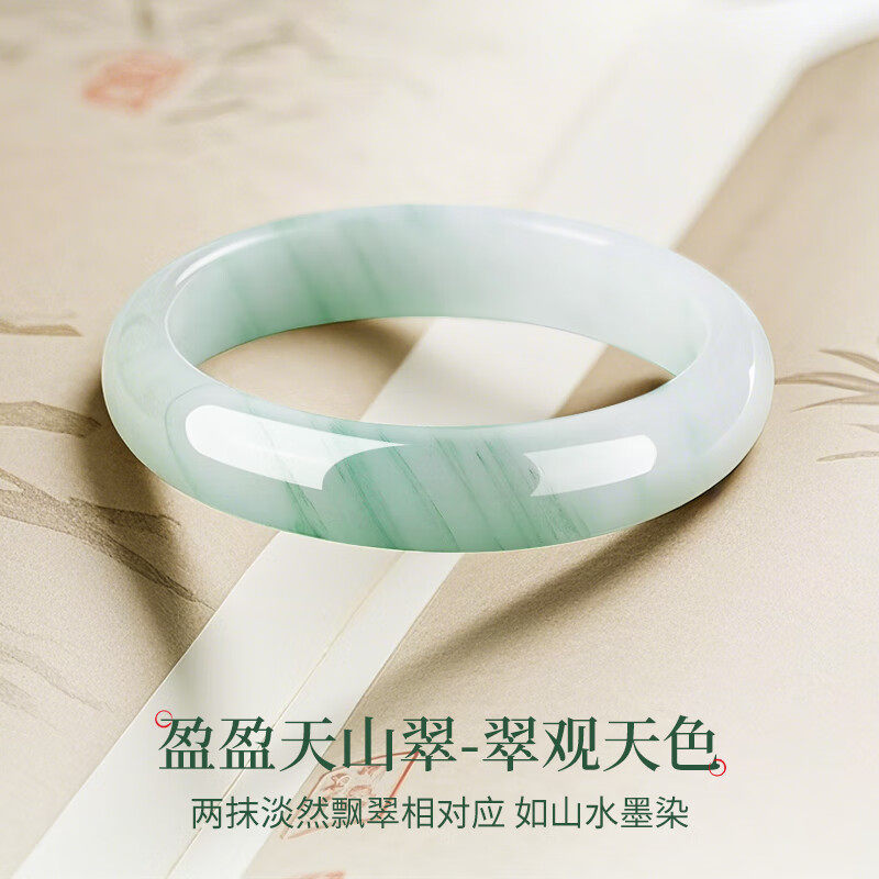 玉石天山翠手镯女款高冰飘花玉镯 新疆正品宽条镯子女友妈妈礼物
