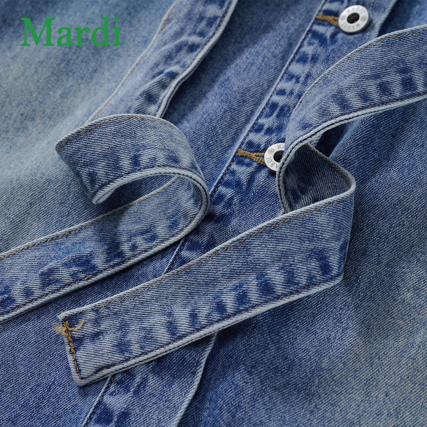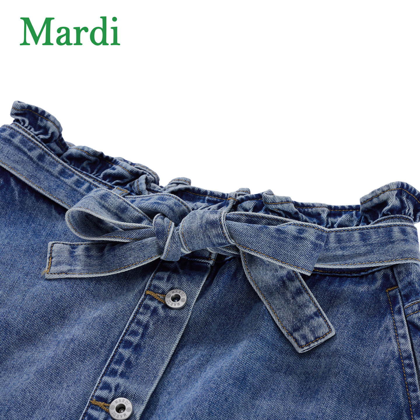 MARDI牛仔风高腰半身裙女中长款系带开叉休闲裙蓝色A字裙腰带纽扣