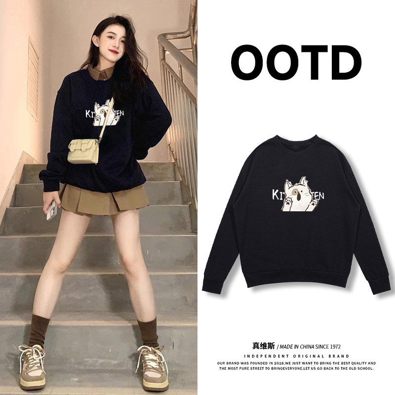 KMV真维斯秋冬圆领卫衣女2025新款爆款宽松黑色上衣美式慵懒外套