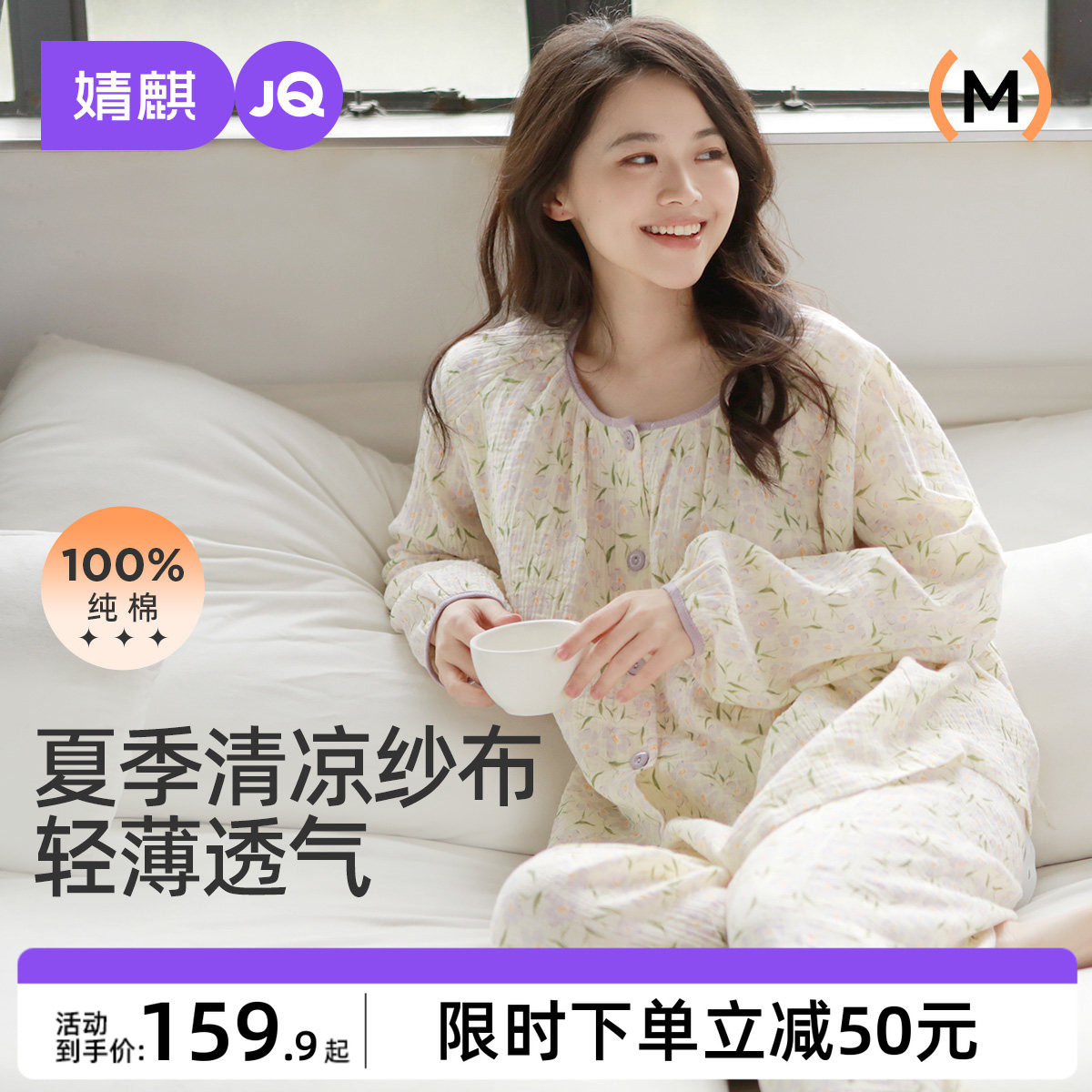 婧麒月子服纯棉纱孕妇睡衣哺乳衣女夏季薄款哺乳套装家居服两件套
