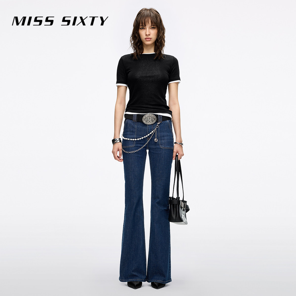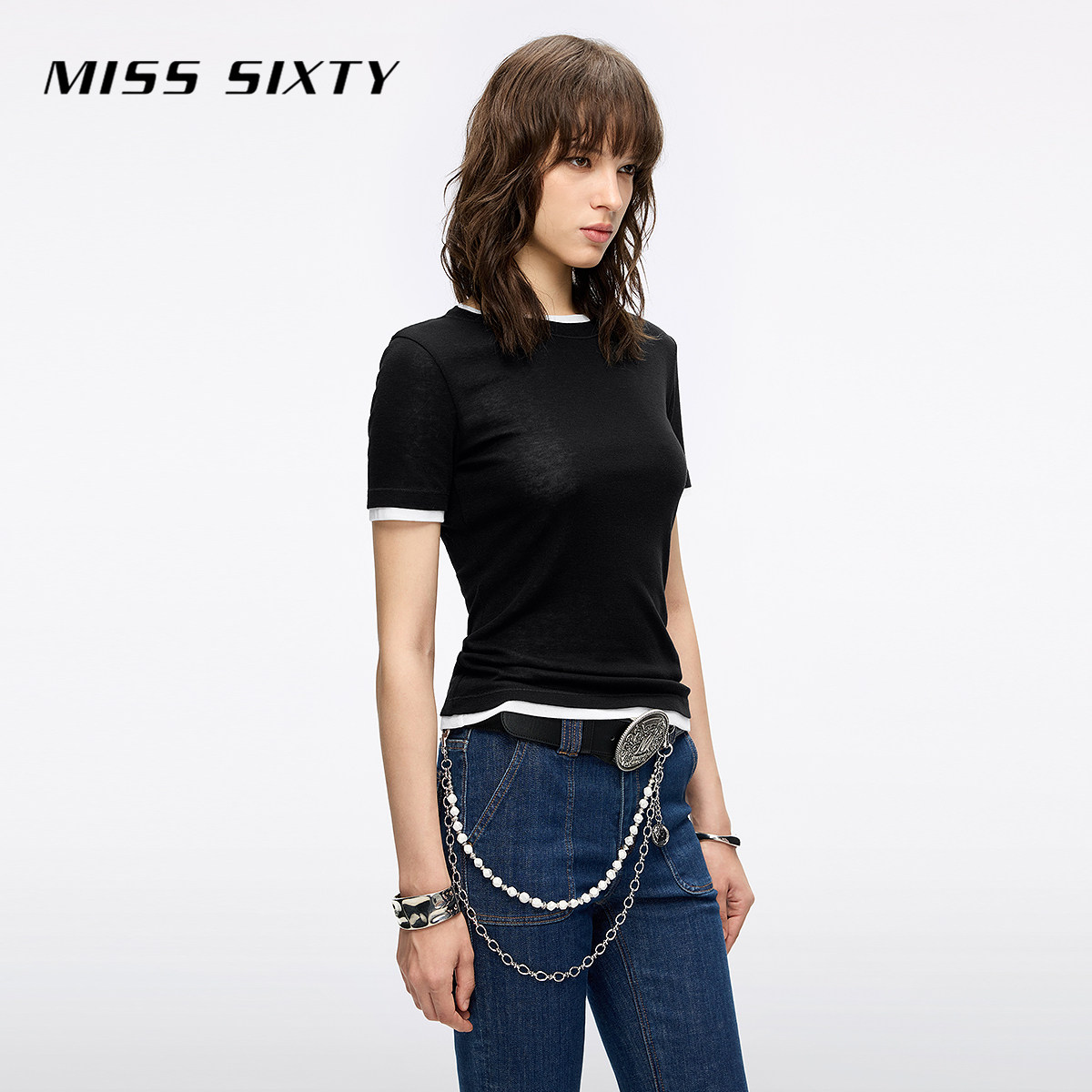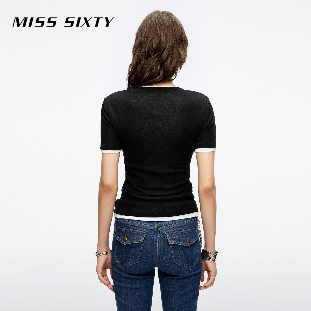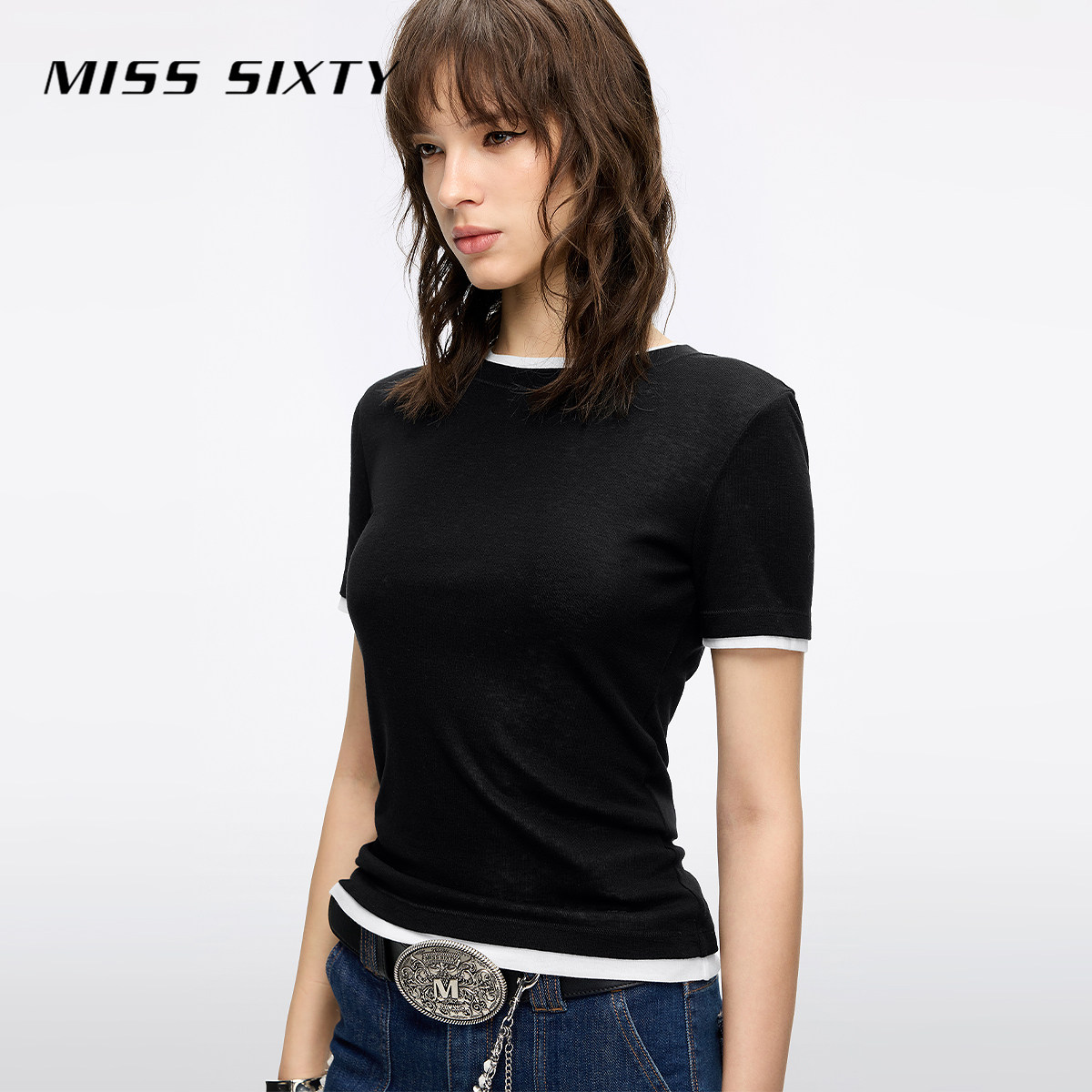 Miss Sixty2025秋季新款短袖T恤女圆领撞色两件套显瘦含羊毛上衣