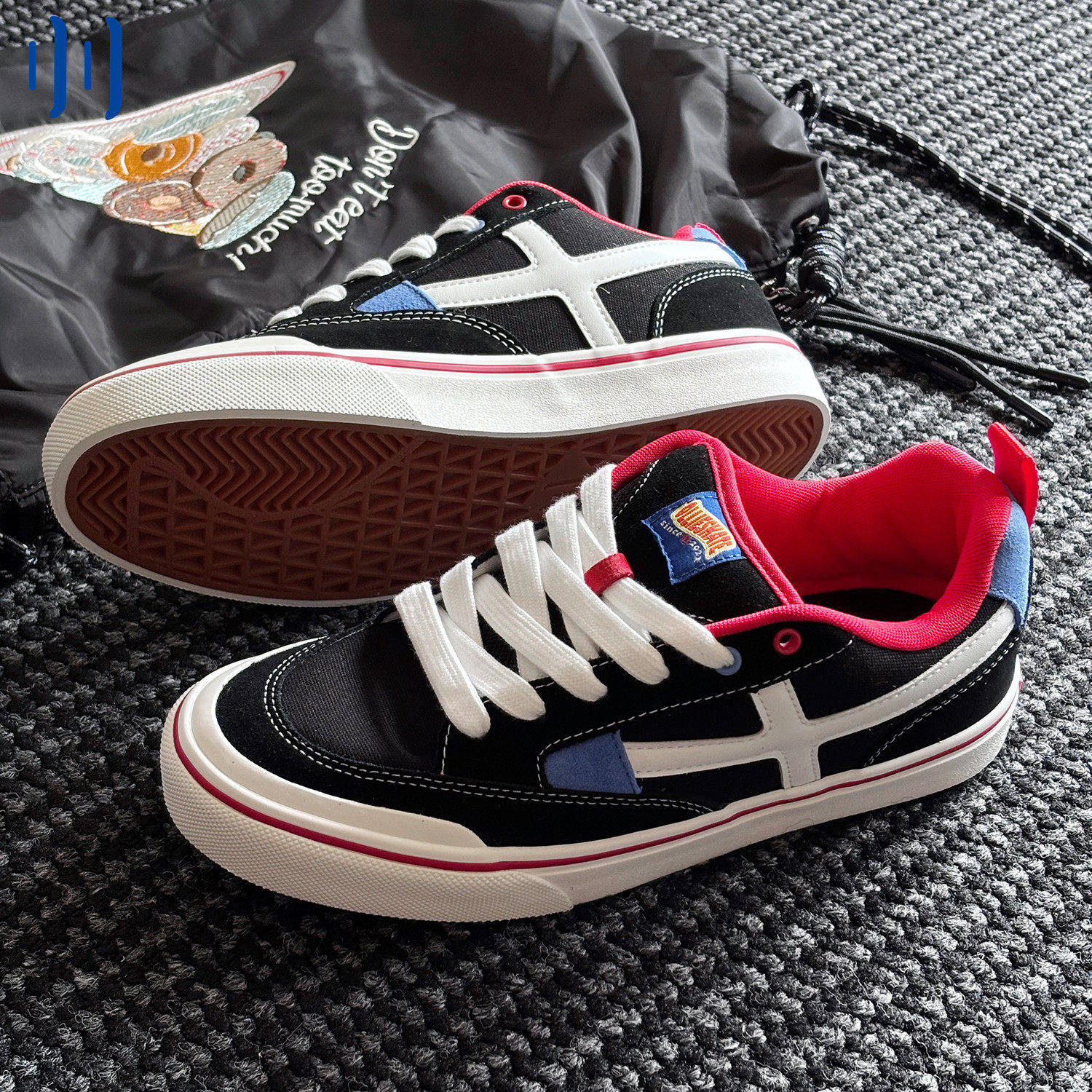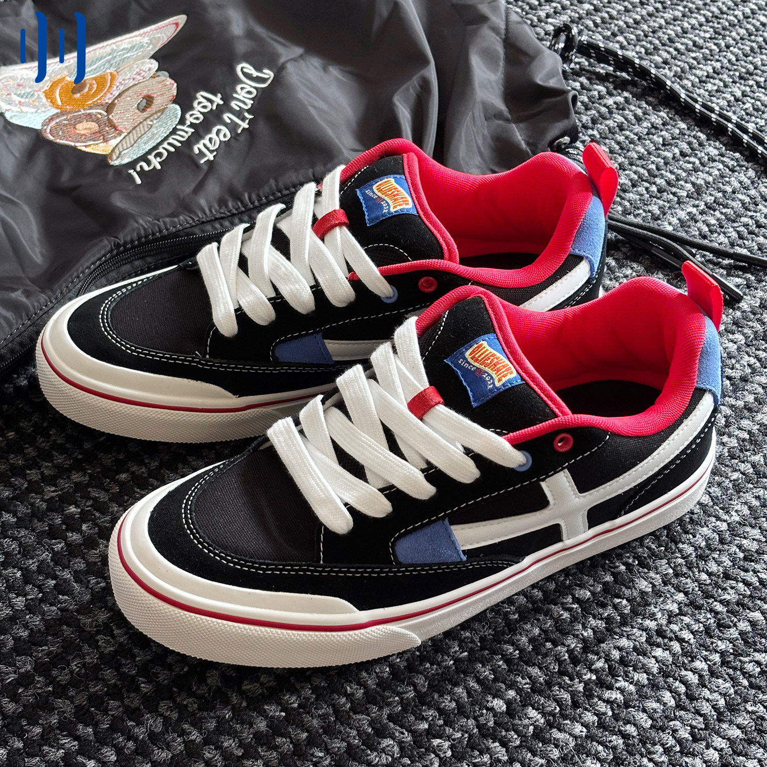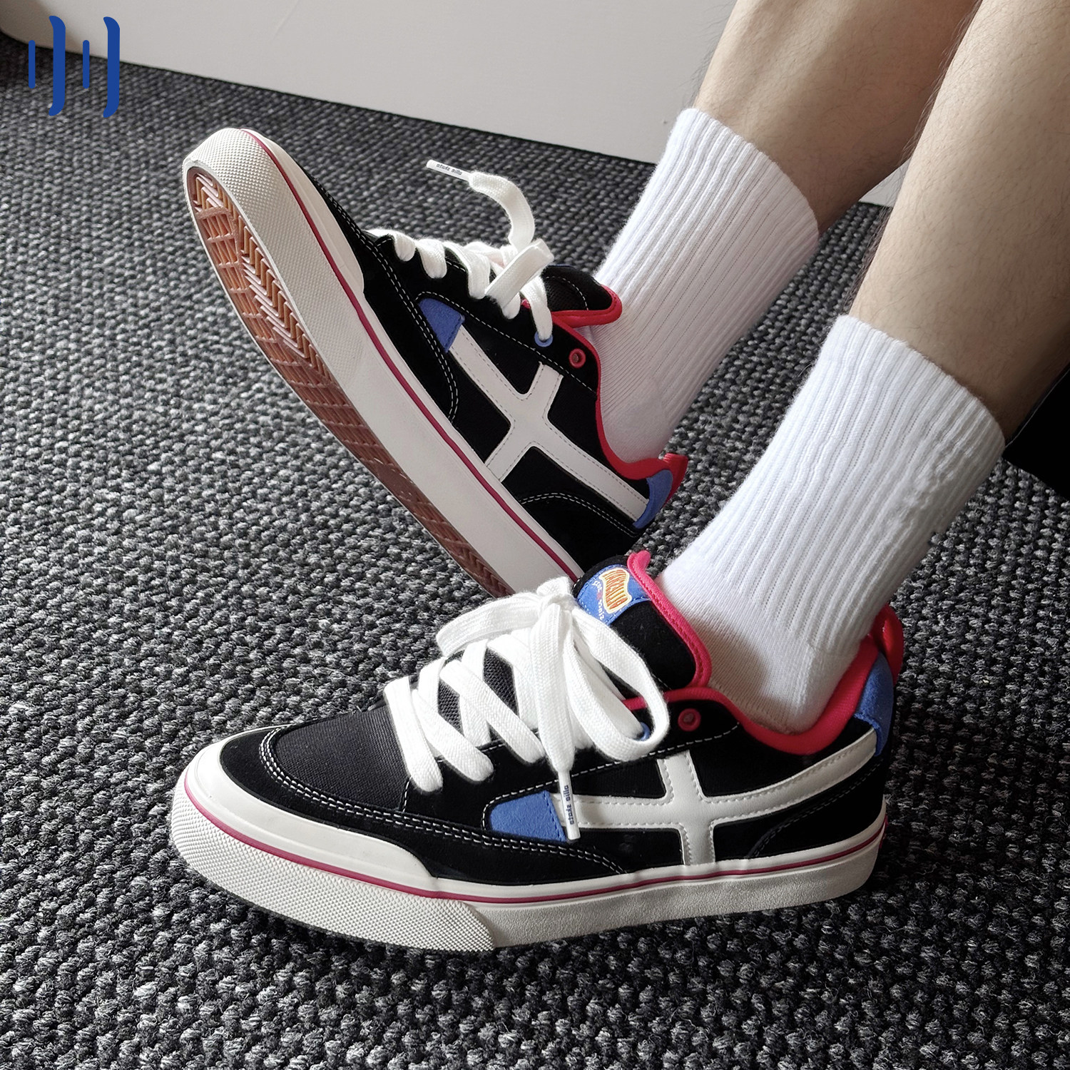 顽刻官方黑蓝红拼色校园风翻毛皮帆布拼接男女国潮滑板鞋