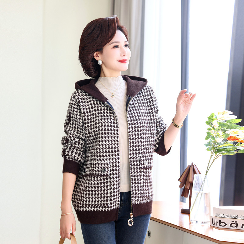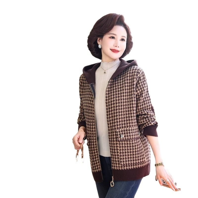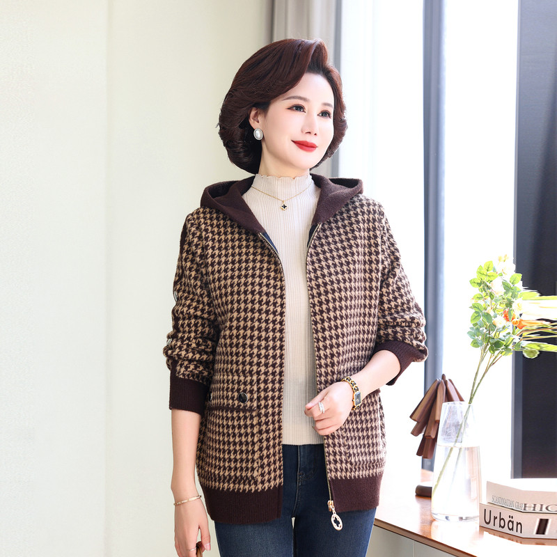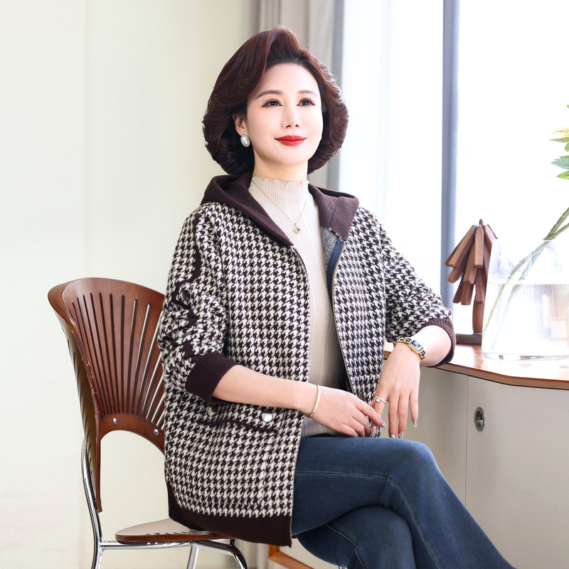 中年妈妈秋冬装加绒千鸟格外套洋气2025新款中老年人女装春秋上衣