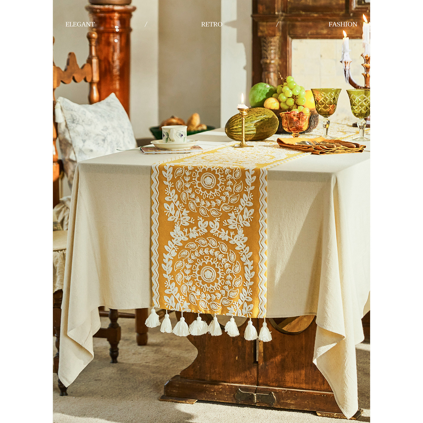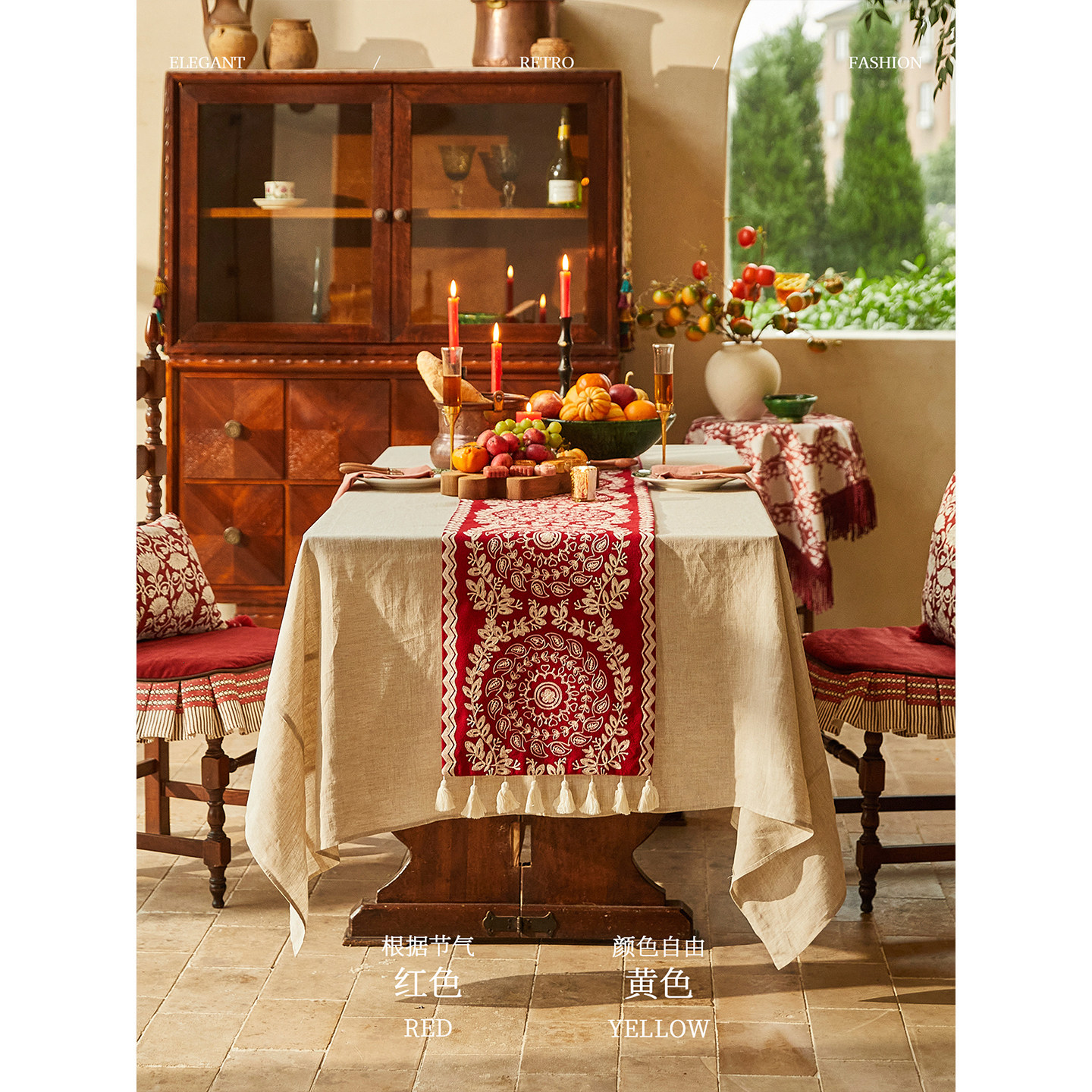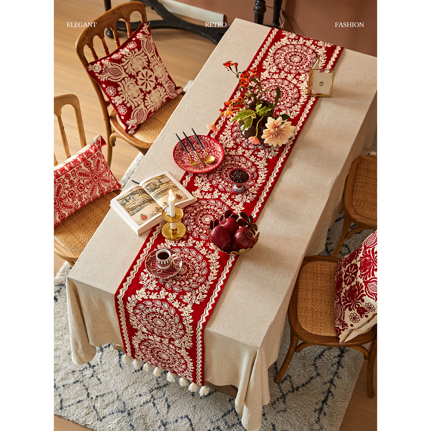 蜡笔派春归麦芒桌旗新年礼物红色轻奢复古禅意台布长条茶几盖布W