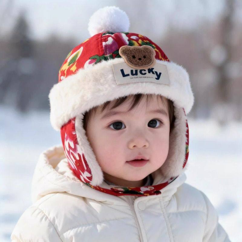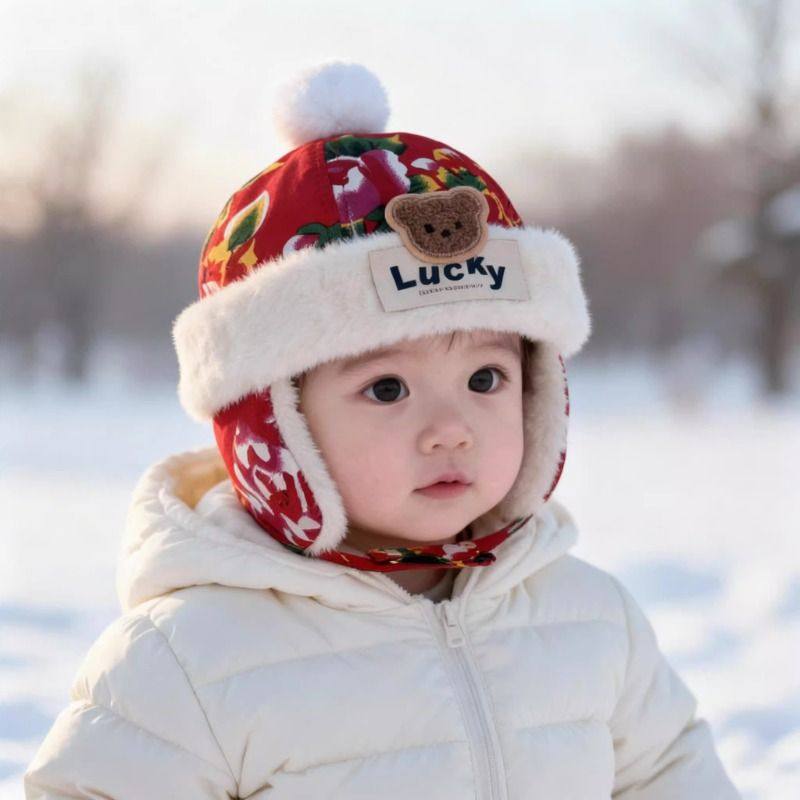 儿童雷锋帽冬季保暖护耳东北大花布宝宝帽子男孩女童防寒帽醒狮