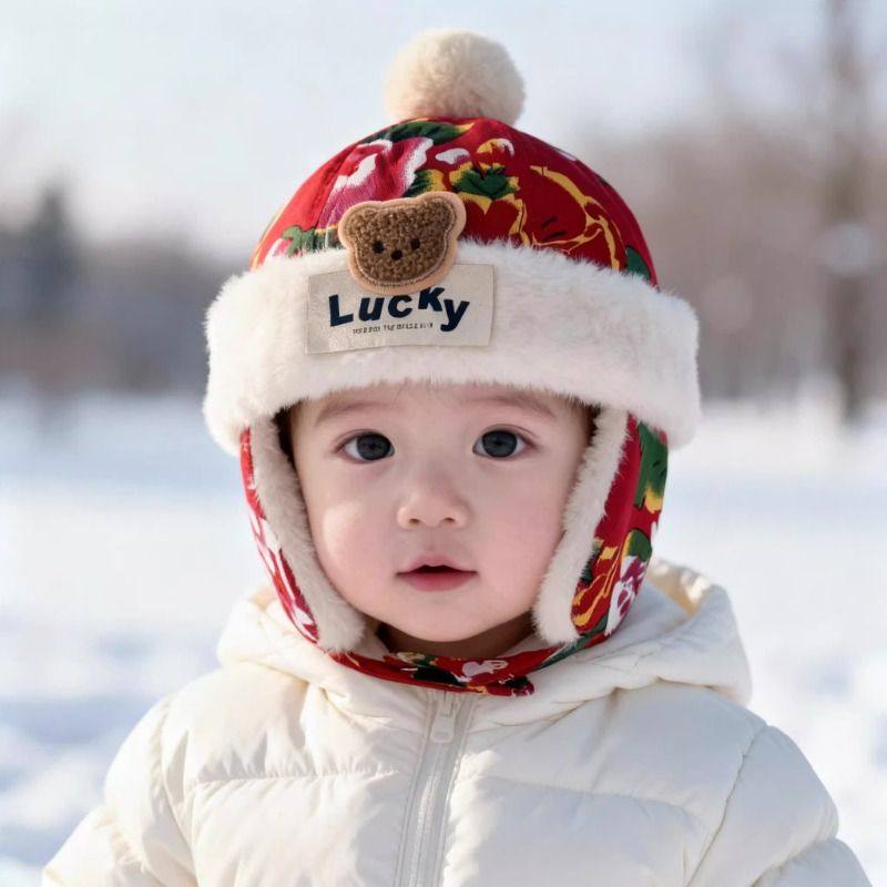 hugz儿童帽子男孩女孩保暖针织毛线帽秋冬季户外护耳防风熊仔帽子