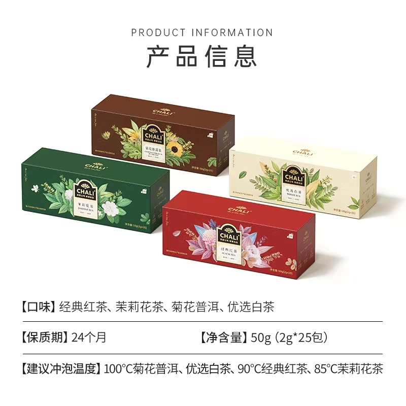 chali盒装茶包袋泡茶25包茶里经典红茶茉莉花茶菊花普洱白茶茶包