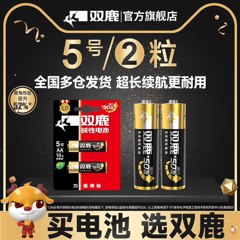 双鹿电池5号2节装碱性LR6聚能AA家用玩具鼠标电池耐用挂闹钟空调电视机遥控器按摩棒耳温枪2粒